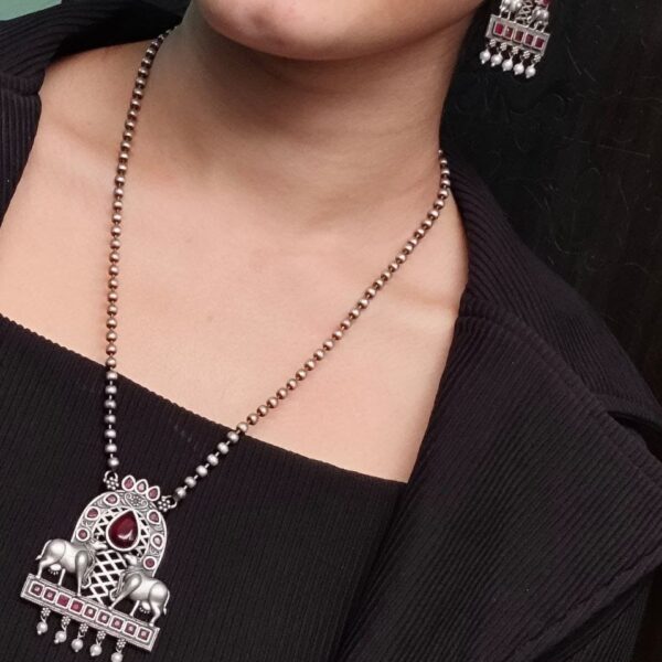 The necklace is complemented by matching earrings, ensuring a coordinated and elegant look. Whether paired with traditional attire like sarees, lehengas, or kurtis, or styled with contemporary fusion outfits, this ethnic set adds a refined touch to any outfit. Its versatile design makes it suitable for both formal and casual occasions, giving you the flexibility to wear it on multiple events.