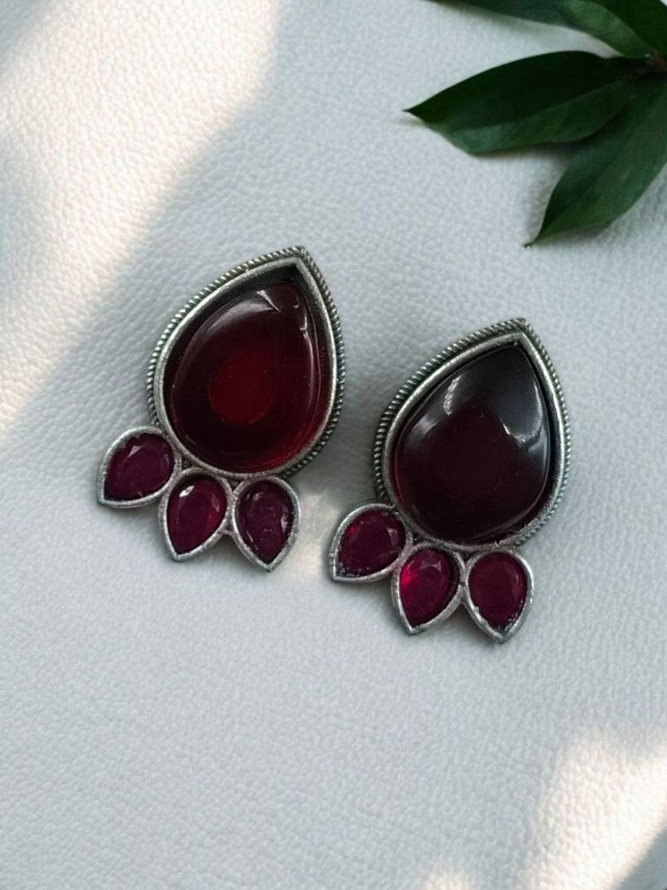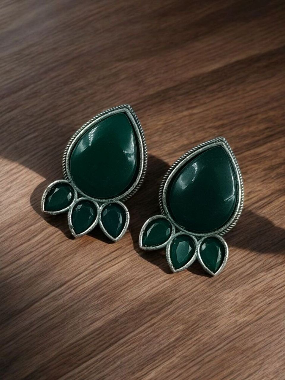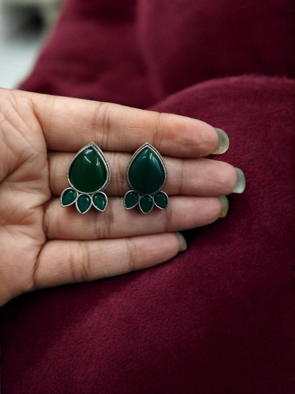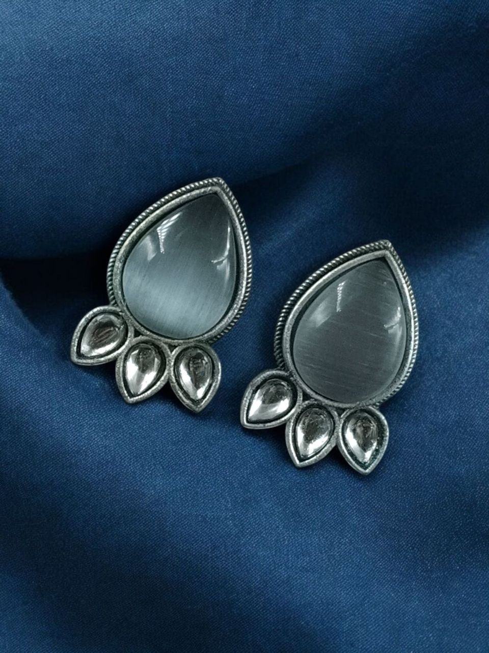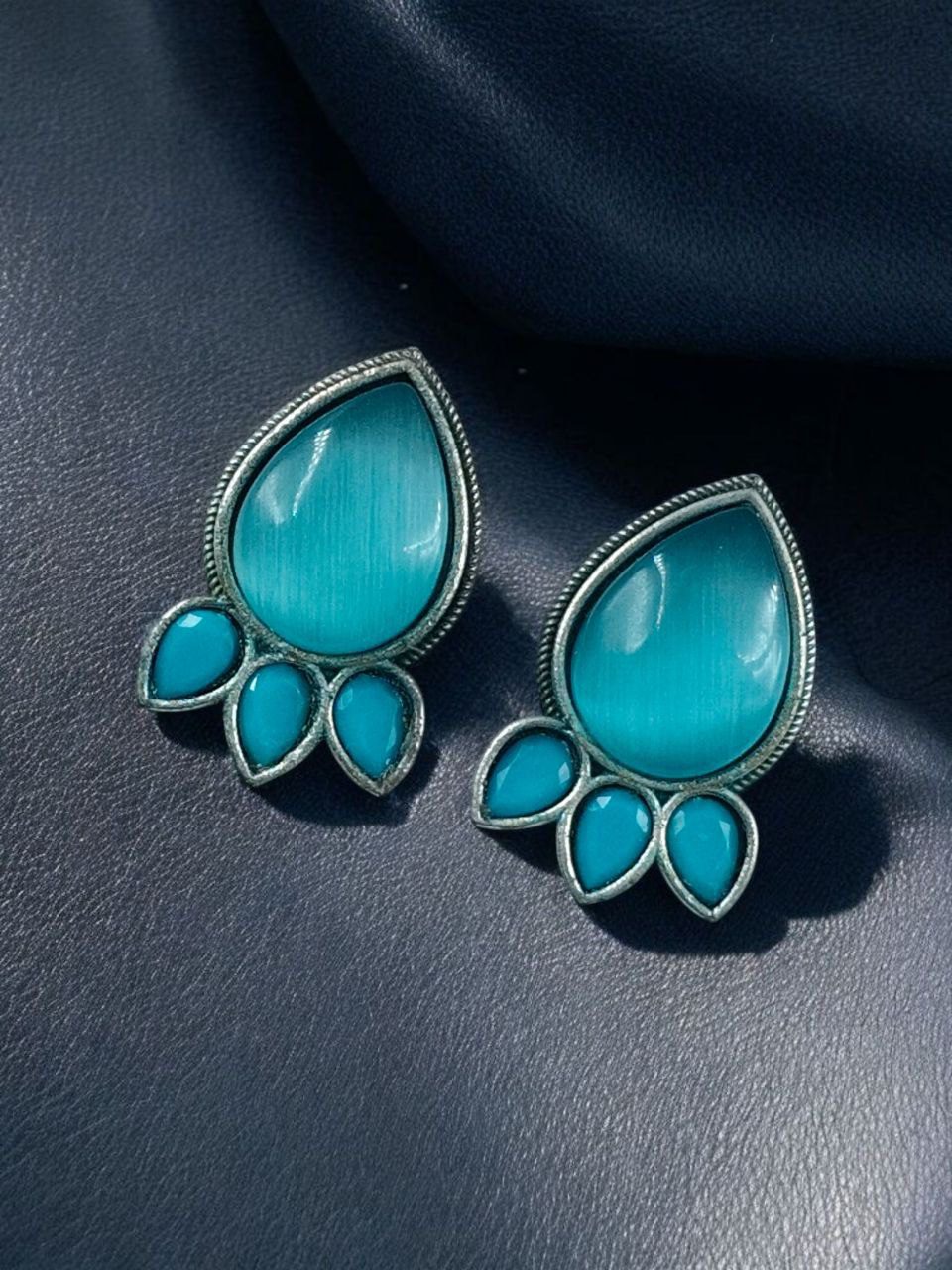 These oxidized stud earrings are made with high-quality metal and finished with a classic silver plating that gives them an authentic traditional look. The highlight of the design is the shimmering Monalisa stone at the center, known for its graceful shine and gemstone-like beauty. The stone sits beautifully within a unique pattern, inspired by traditional Indian motifs with a modern twist, creating a look that is both ethnic and sophisticated.