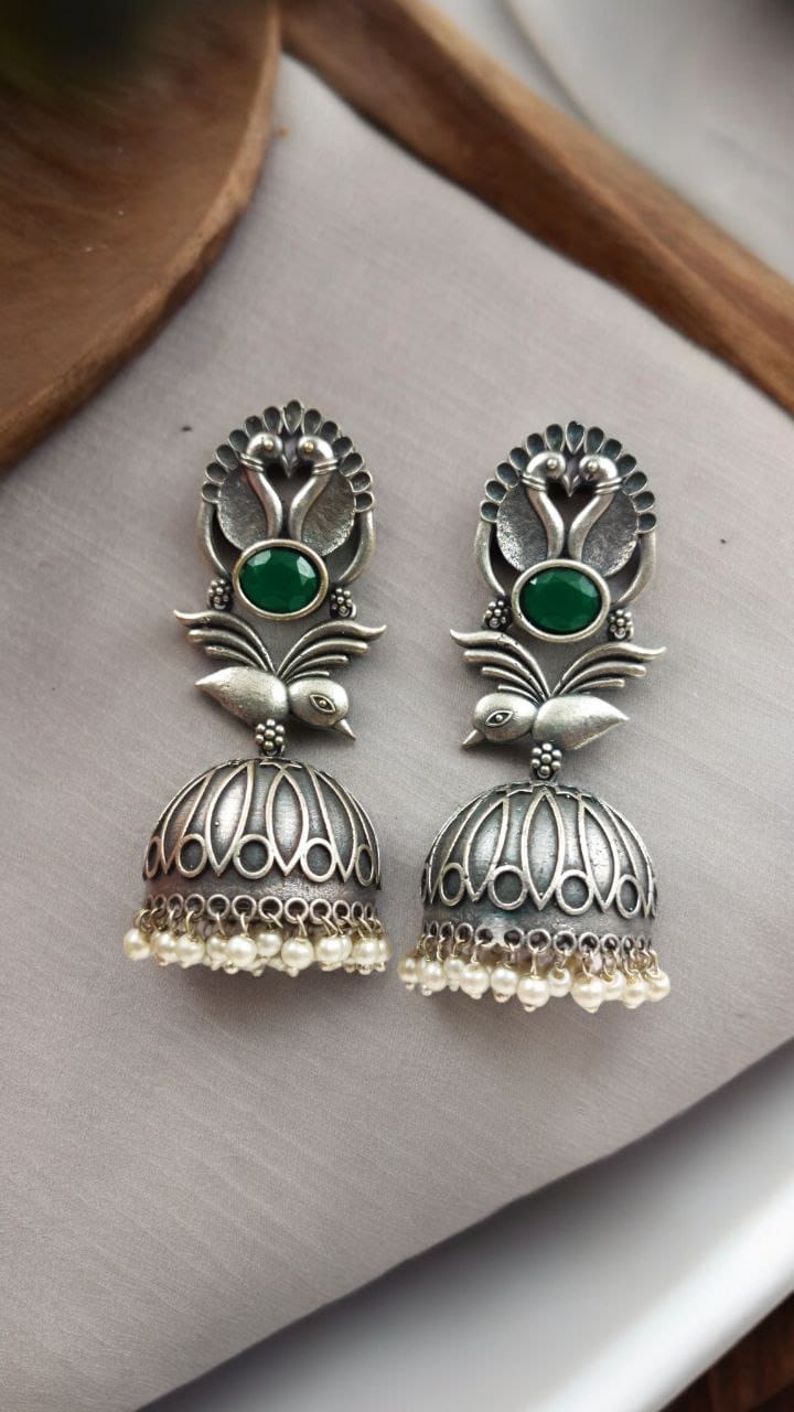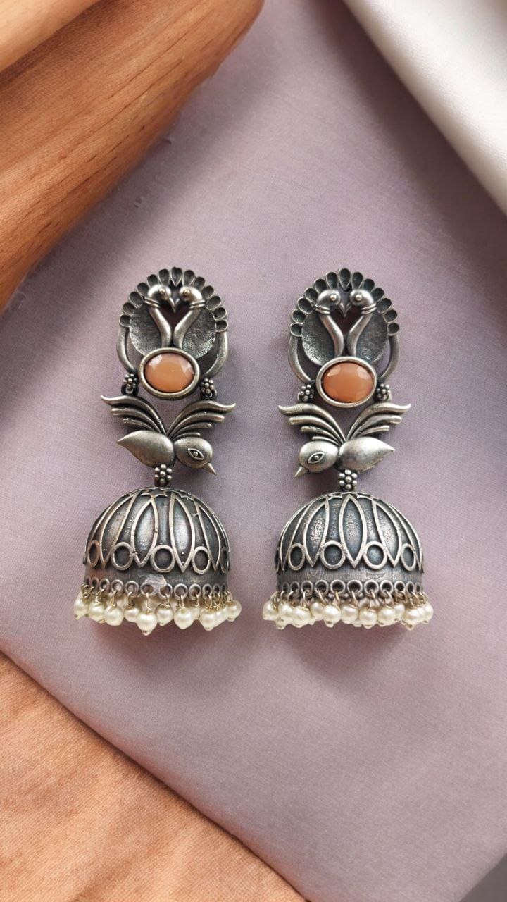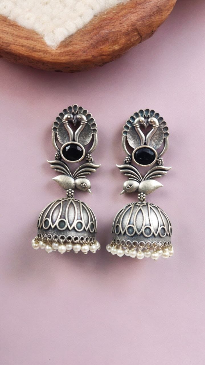 Elevate your accessory game with our Fashion-Forward Oxidised Silver Look Like Replica Bird Jhumka Earrings. Combining traditional elegance with modern flair, these earrings are more than just a piece of jewelry ? they are a statement of style and sophistication. Add these stunning earrings to your collection and let your unique fashion sense shine through.