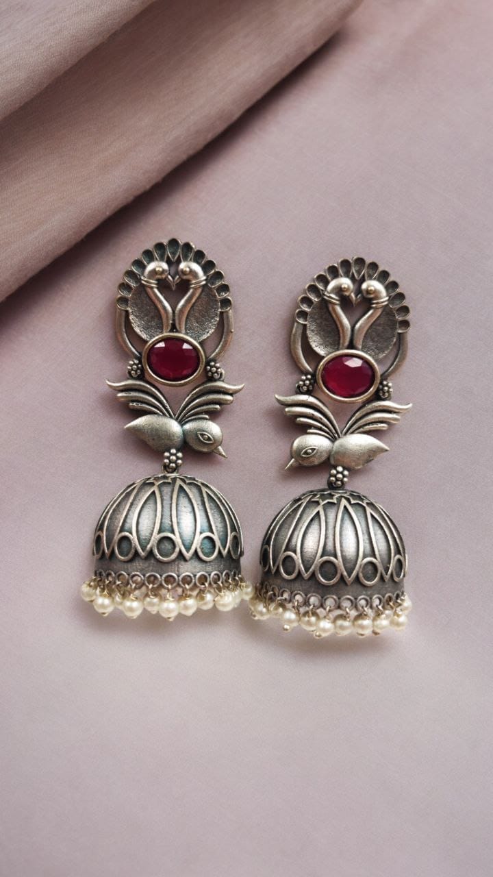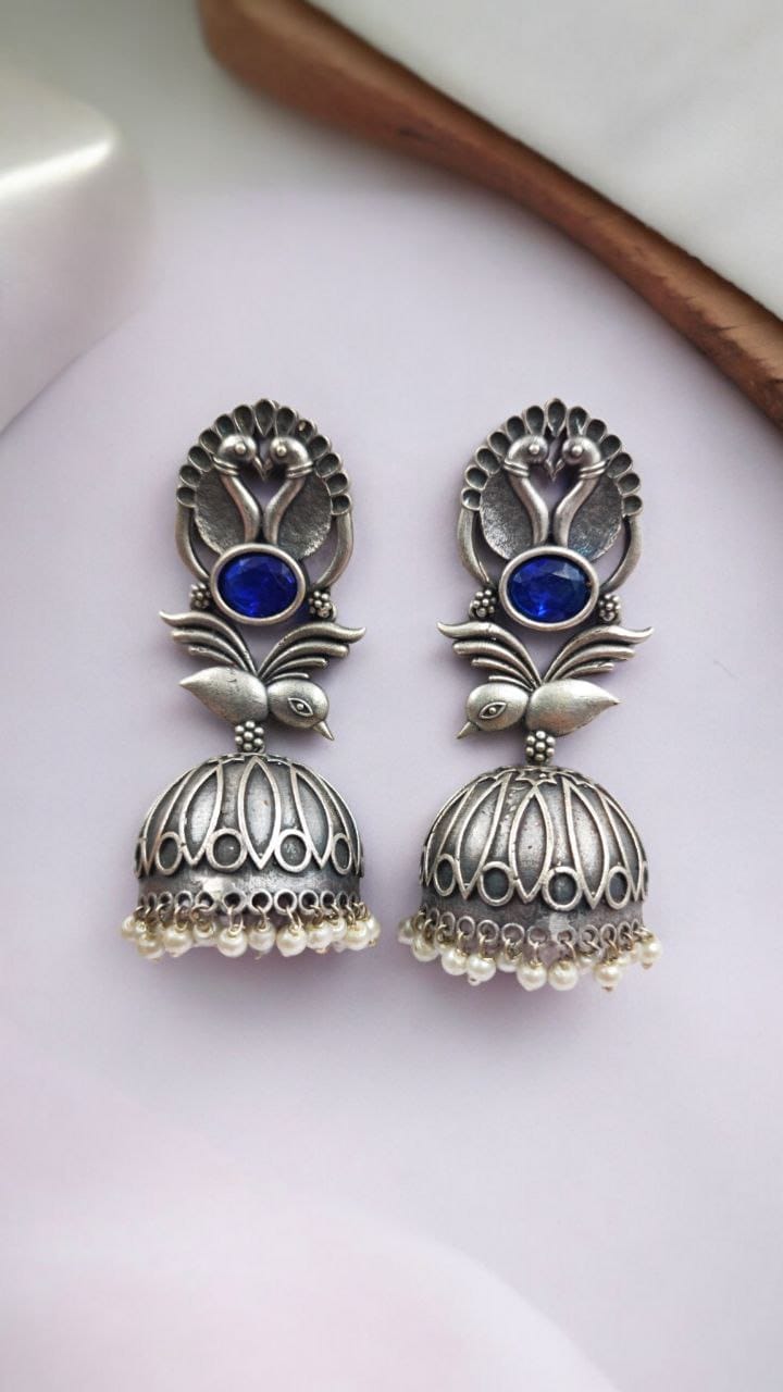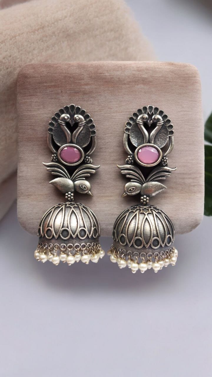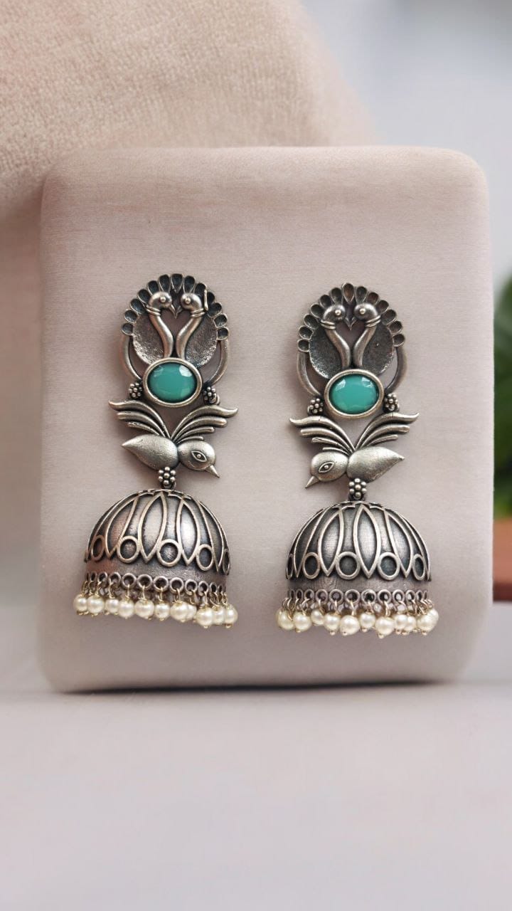 Elevate your accessory game with our Fashion-Forward Oxidised Silver Look Like Replica Bird Jhumka Earrings. Combining traditional elegance with modern flair, these earrings are more than just a piece of jewelry ? they are a statement of style and sophistication. Add these stunning earrings to your collection and let your unique fashion sense shine through.