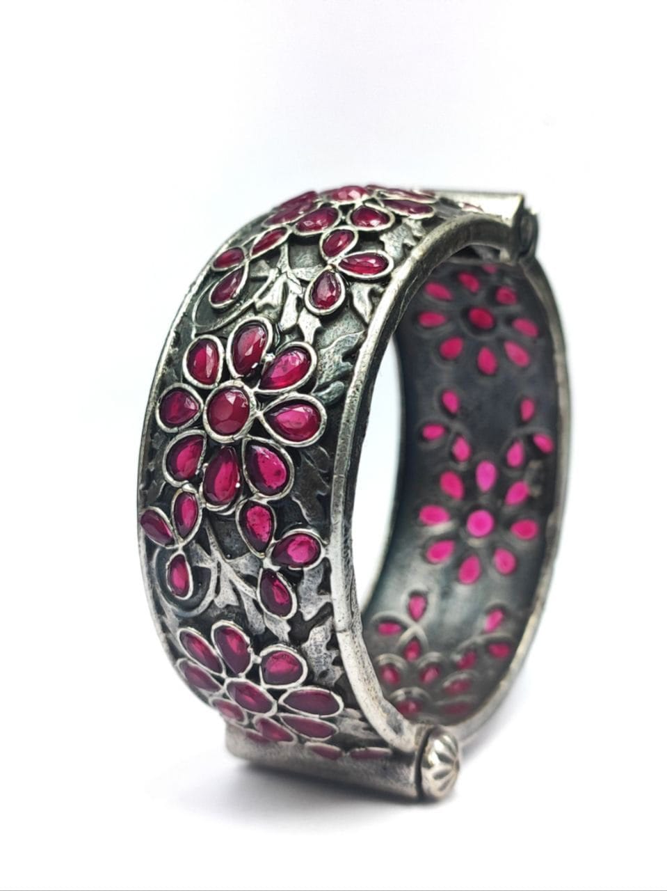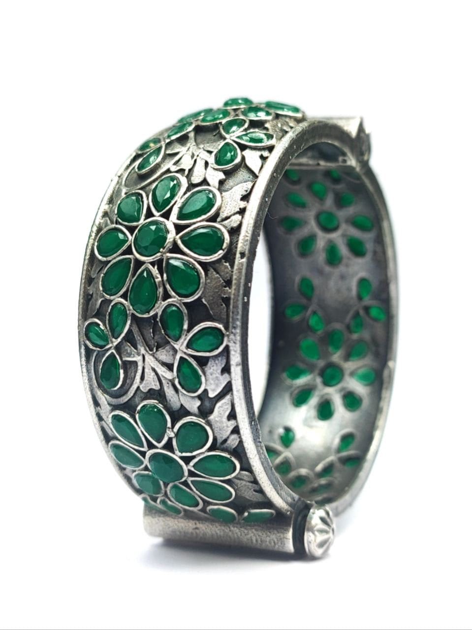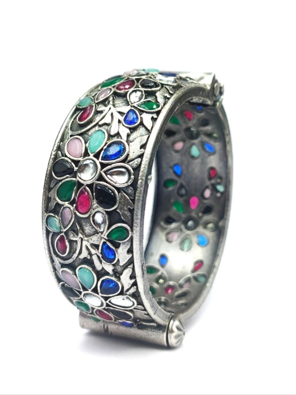 Introducing our exquisite collection of Silver Replica Floral Art Oxidised Free Size Bangle Kada, handcrafted with precision and care by D9creation. Each piece is a work of art, showcasing a blend of traditional craftsmanship and contemporary design.