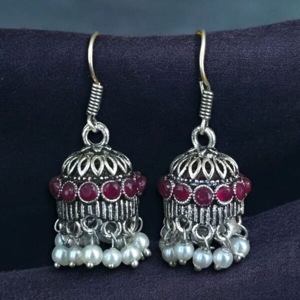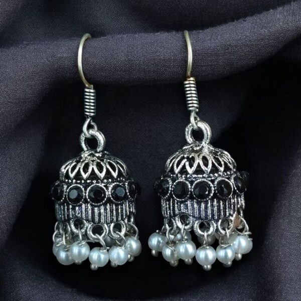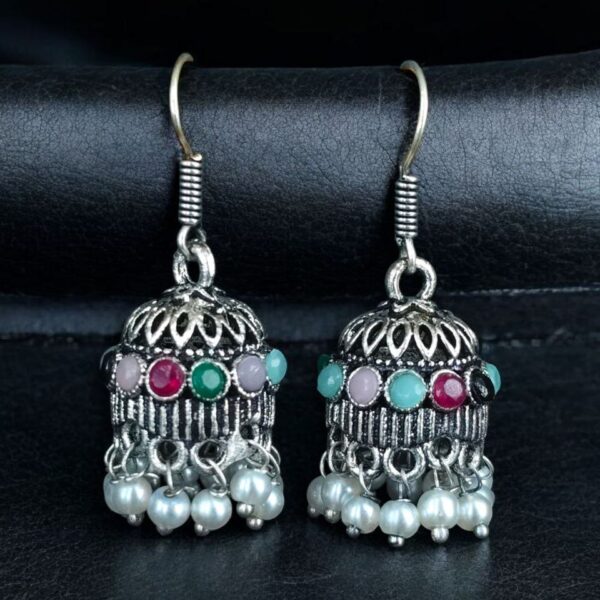 The jhumka style has been a favorite in ethnic jewelry for centuries, and this design takes it a step further by incorporating German silver craftsmanship with a beautiful oxidized finish. The addition of pearls and stones gives it a refined charm, making it ideal for women who love a mix of heritage and contemporary appeal. The hook dangler design not only ensures easy wear but also enhances the overall aesthetic with a free-flowing, elegant look.