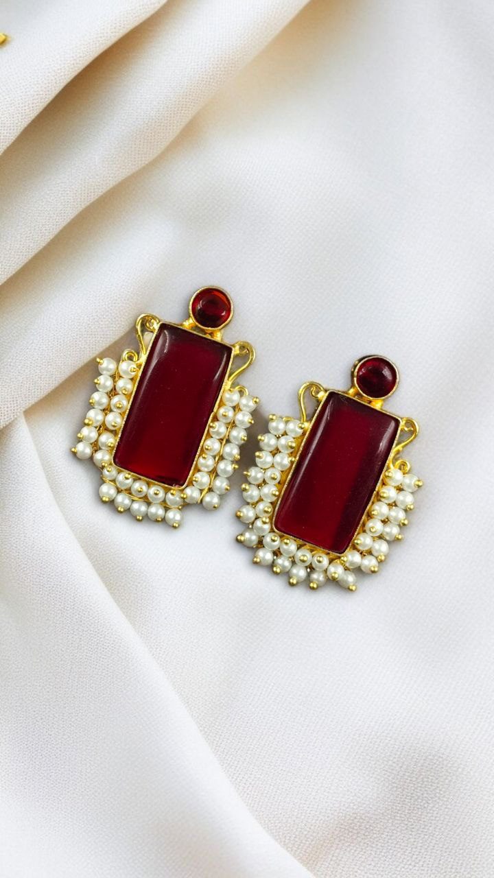 Crafted with precision and passion, each stud features a geometric design that adds an edgy and structured appeal, making it perfect for modern wardrobes. At the heart of these? Stone Stud Earrings its a radiant Monalisa stone, renowned for its gemstone-like glow and graceful allure. The striking stone is framed with delicate pearl detailing, creating a beautiful contrast of texture and shine.