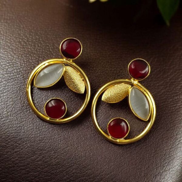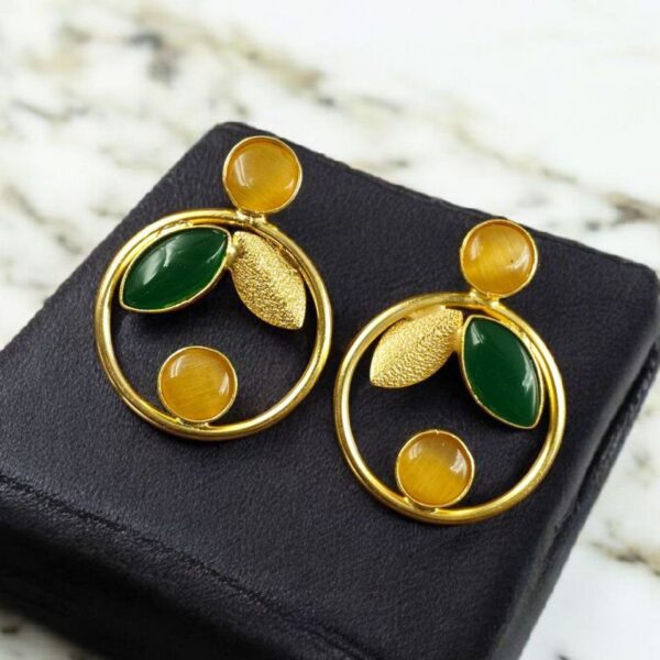 Expertly crafted with premium-quality gold plating, these Circle Design Earrings feature a unique combination of Circle Design Earrings, beautifully complemented by a lustrous Monalisa stone at the center. The warm glow of the gold finish enhances the natural beauty of the stone, creating a luxurious yet subtle accessory that works well with all skin tones and fashion styles.
