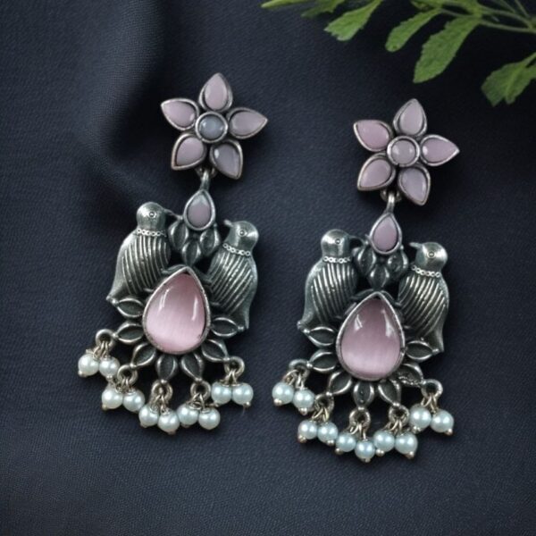 Each earring is meticulously handcrafted to showcase a beautifully detailed bird motif, complemented by floral accents that enhance its artistic appeal. The Monalisa stones add a radiant shimmer, reflecting light beautifully, while the pearl drop at the bottom creates a graceful movement with every turn. The intricate design reflects skilled craftsmanship, making these Bird Dangler Earrings a standout piece in any jewelry collection.