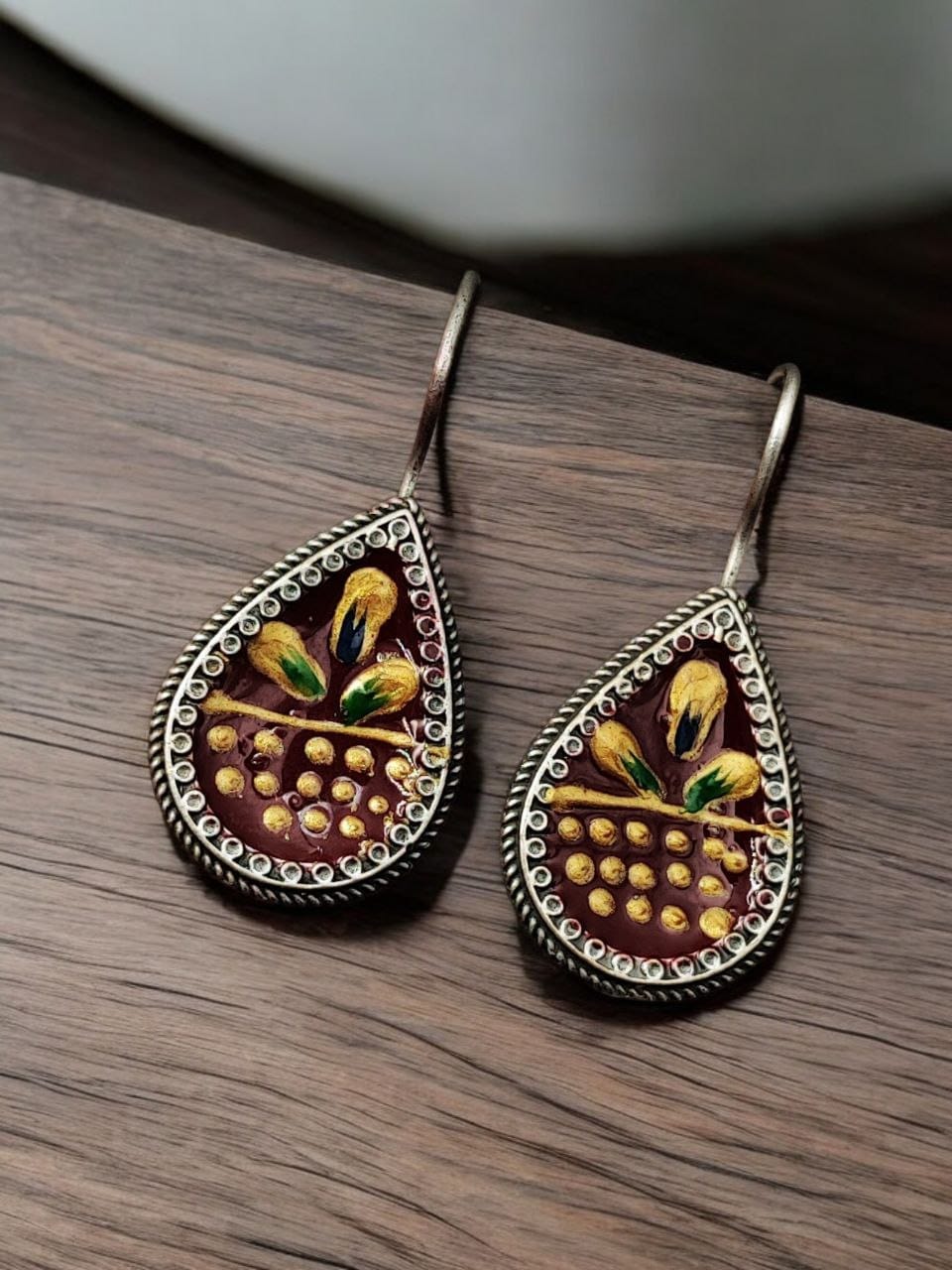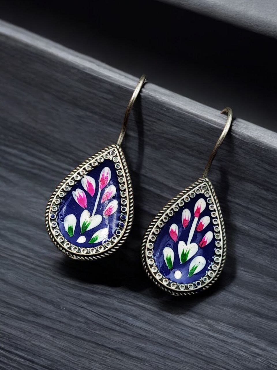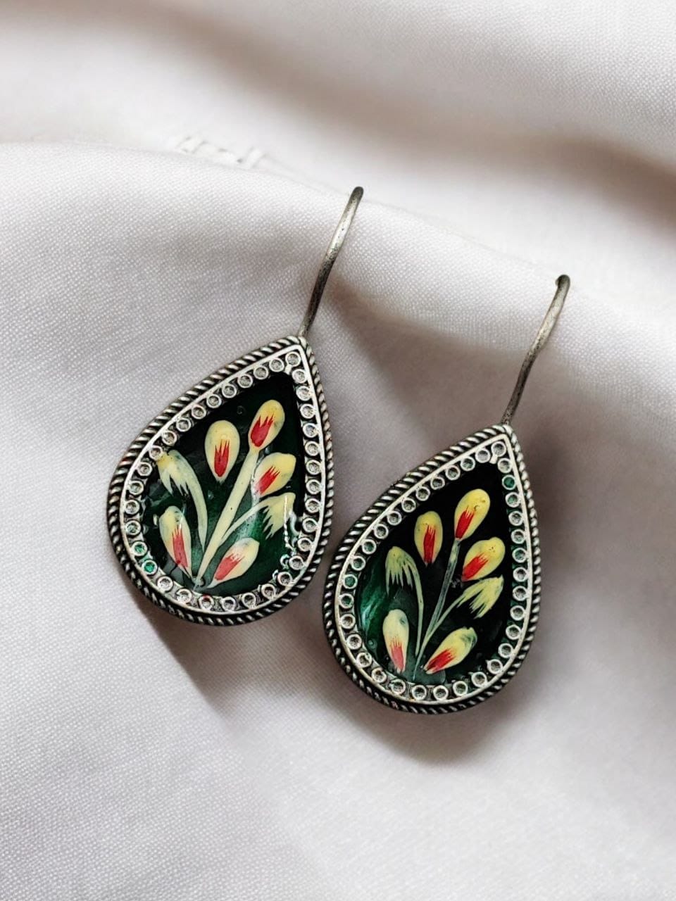 Add a touch of artisanal elegance to your accessory collection with these?Hand-Painted Earrings?crafted in?Silver Replica?style. Designed for girls who love to embrace unique jewelry, these stunning earrings blend traditional craftsmanship with contemporary appeal, making them perfect for both casual outings and party-wear.