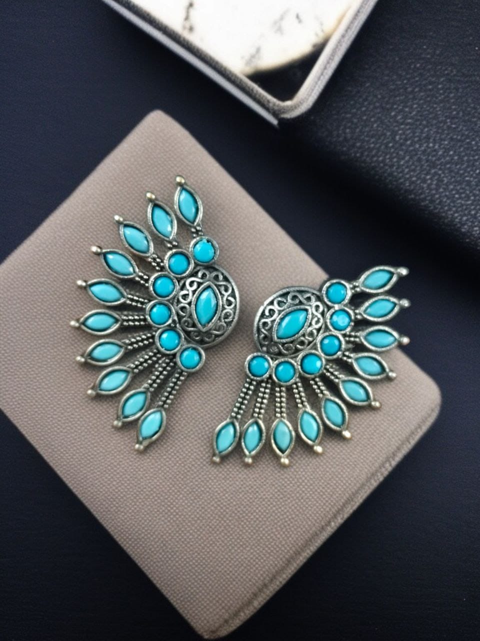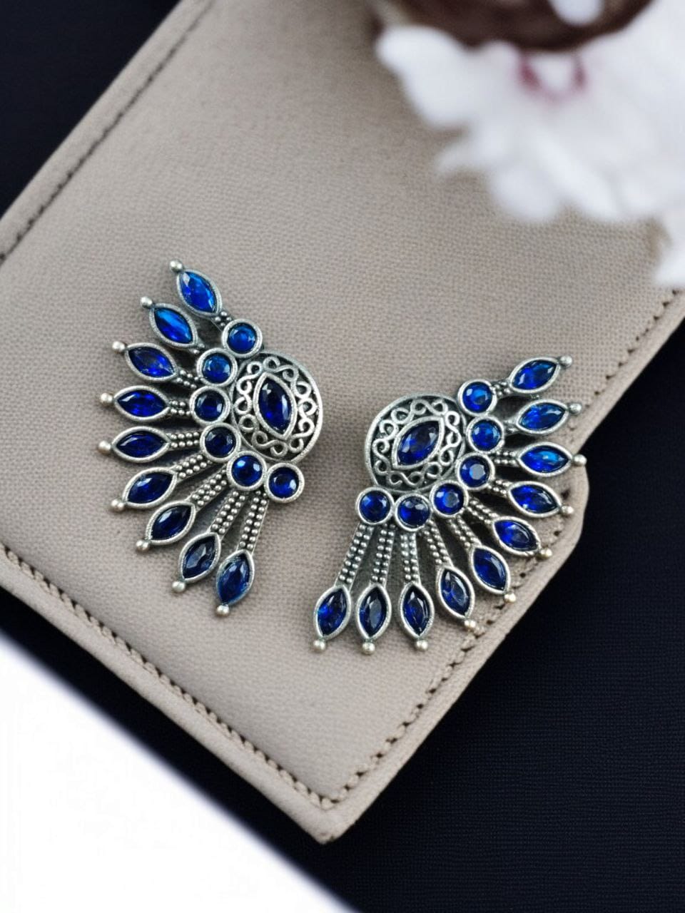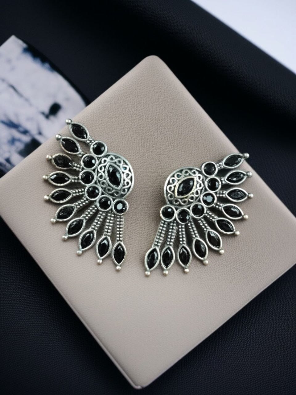 These lightweight silver replica Feather Style Earrings are meticulously handcrafted, showcasing an intricate feather-inspired design. The detailed ancient wing pattern represents freedom, grace, and elegance, making them a perfect choice for those who love symbolic jewelry. The high-quality oxidized silver finish adds a vintage appeal, while the delicate stone work earrings enhance their overall charm.