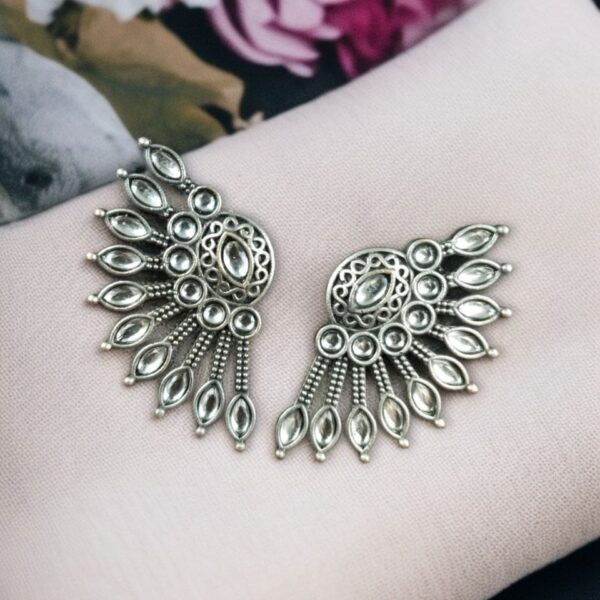 Upgrade your collection with these Handcrafted Ancient Feather Style Feather Style Earrings and embrace a look that blends heritage with contemporary fashion. Order yours today and experience the elegance of silver replica jewelry with intricate stone work detailing.
