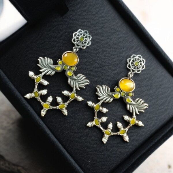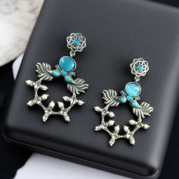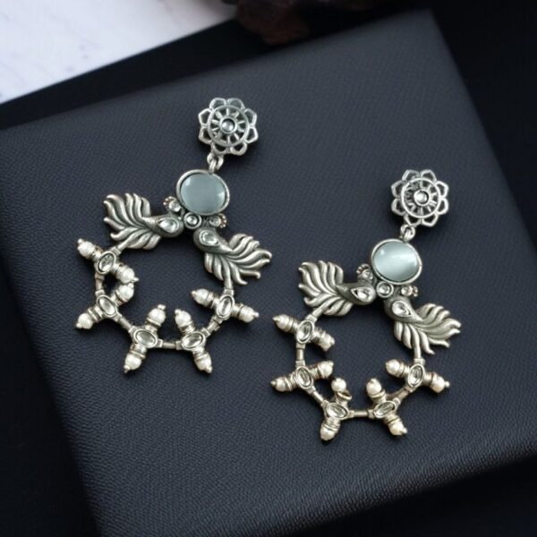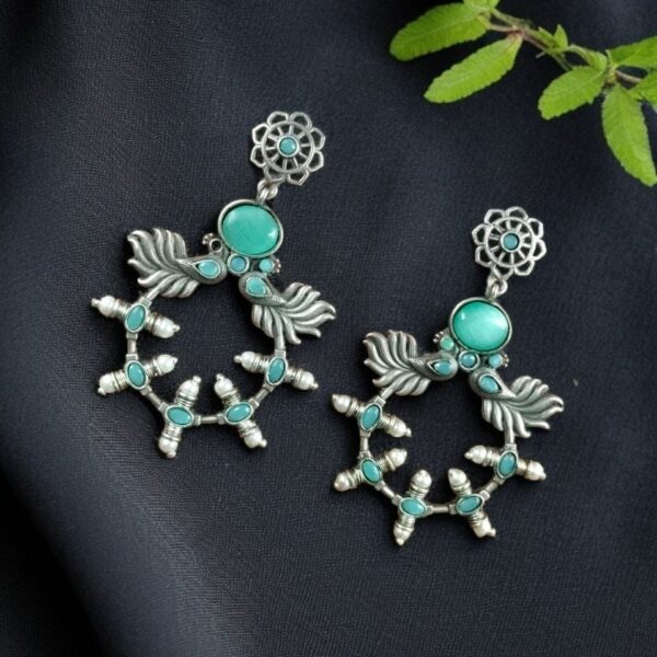 Made from high-quality oxidized silver, these earrings provide the perfect antique look that complements both ethnic and western outfits. The delicate floral motif enhances their charm, while the Monalisa stone accents add a subtle yet striking sparkle. Whether you are dressing up for a festive celebration or looking for an everyday statement piece, these Peacock Inspired Earrings are designed to elevate your style effortlessly.