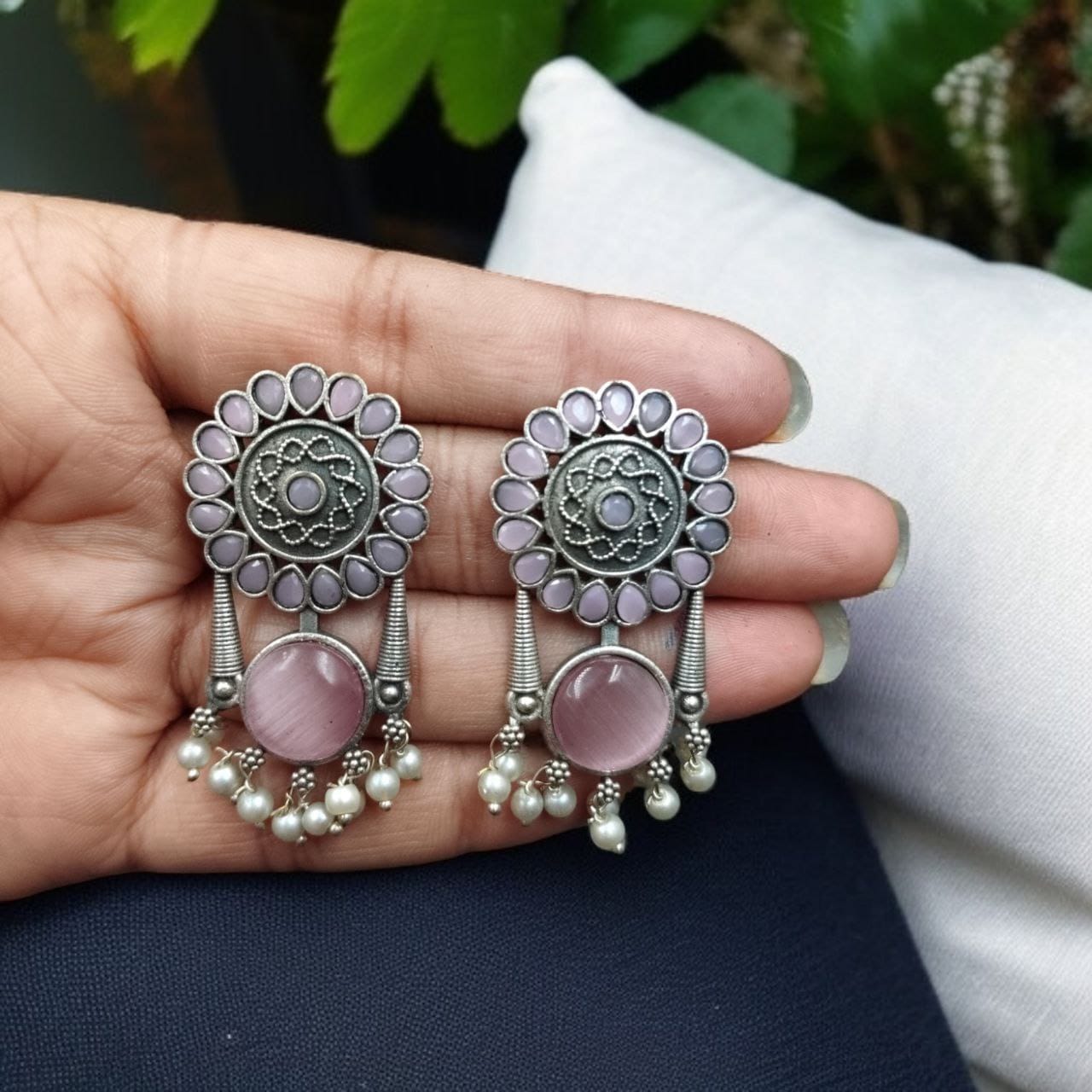 Enhance your jewelry collection with these Handcrafted Silver Look Earrings, featuring an elegant flower design adorned with Monalisa stones and pearls. Perfect for those who appreciate timeless beauty, these Silver Look Earrings bring together traditional craftsmanship and contemporary elegance, making them a must-have for every fashion-conscious woman.