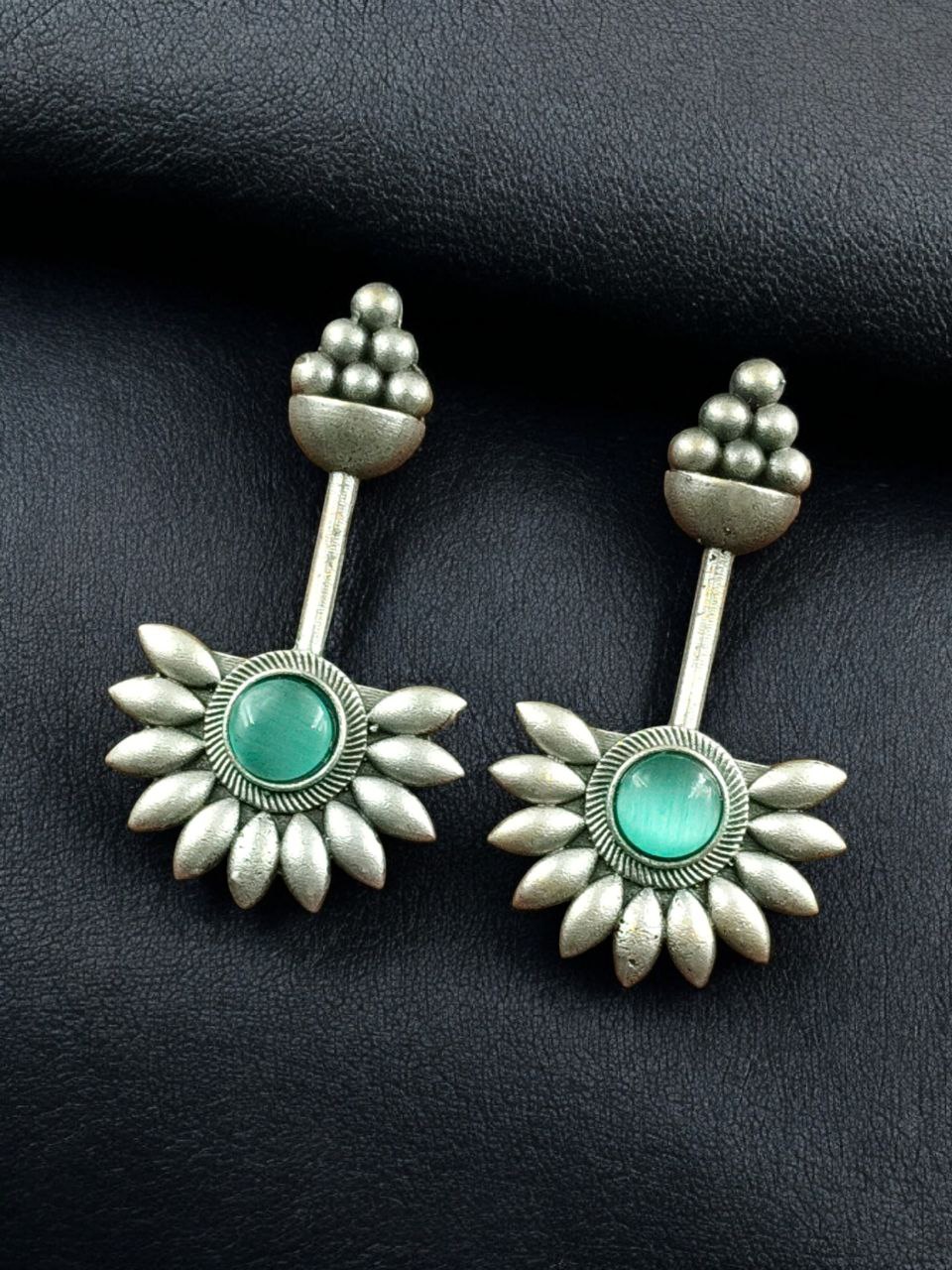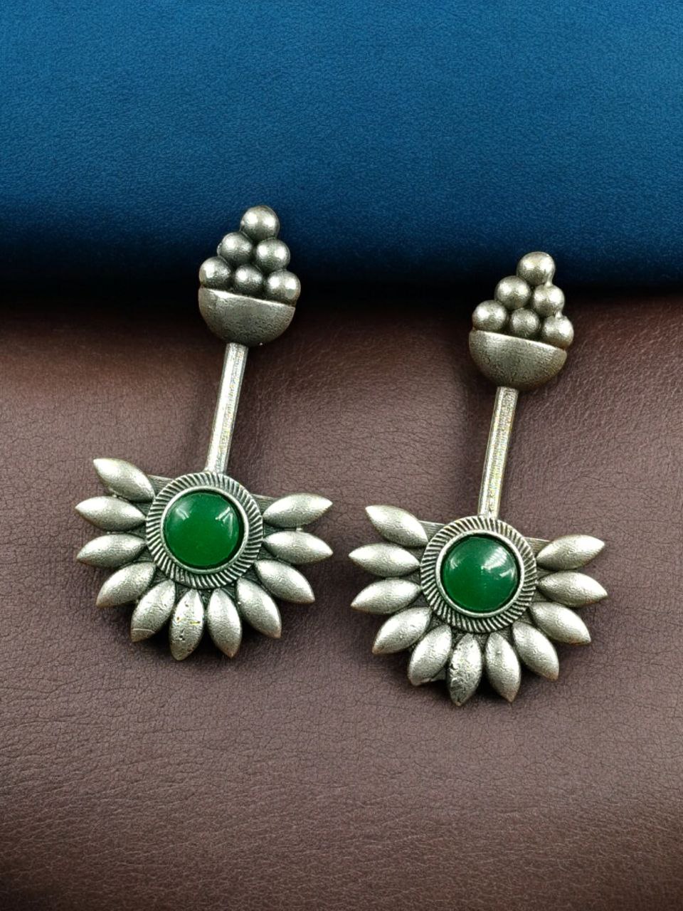 The highlight of these Unique Design Stud Earrings is the beautifully polished Monalisa stone, known for its smooth texture and rich, luminous appearance. Set carefully within a silver replica base, the stone adds depth and sophistication to the design. The unique handcrafted pattern enhances the stone?s natural charm, giving the earrings a premium and artistic look that stands out without being overpowering.