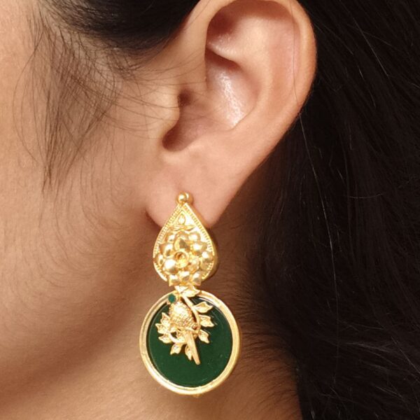 Design: The earrings feature a replica of a Jhumka, a majestic known for its vibrant feathers and graceful demeanor. The Drop Monalisa Stone design is intricately carved and showcases the Jhumki beautiful plumage, including its elegant feathers and distinctive eye patterns.