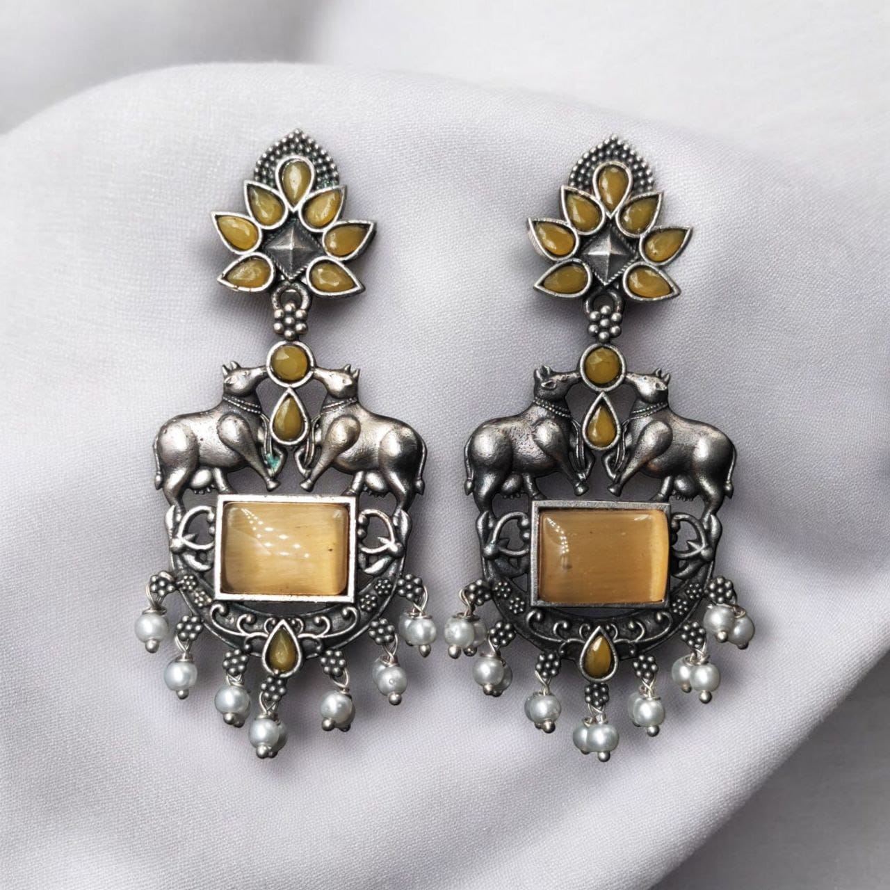 Perfect for gifting or treating yourself, these Lightweight Oxidized Nandi Earrings with silver touch and Monalisa stones are sure to become a treasured addition to your jewelry collection. Whether you are a fan of cultural designs or simply love unique jewelry, these earrings offer the perfect combination of beauty, comfort, and meaning.