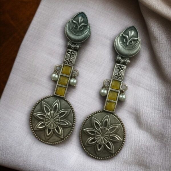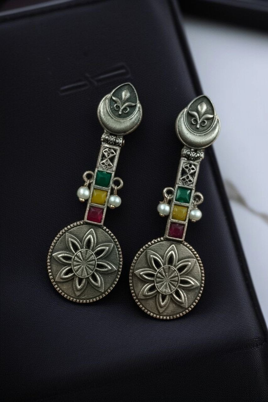 Designed for the modern woman who values tradition, these Flower Dangler Earrings feature a detailed floral pattern that highlights the essence of classic jewelry. Each earring is adorned with shimmering Monalisa stones and delicate pearl drops that sway gently with every move, adding a graceful charm to your overall look. The silver oxidised plating enhances the vintage appeal, giving the earrings a rustic yet refined character that pairs seamlessly with both ethnic and fusion outfits.