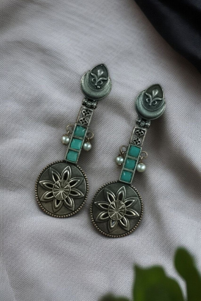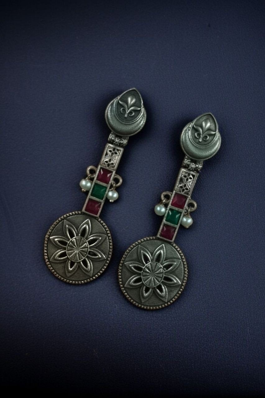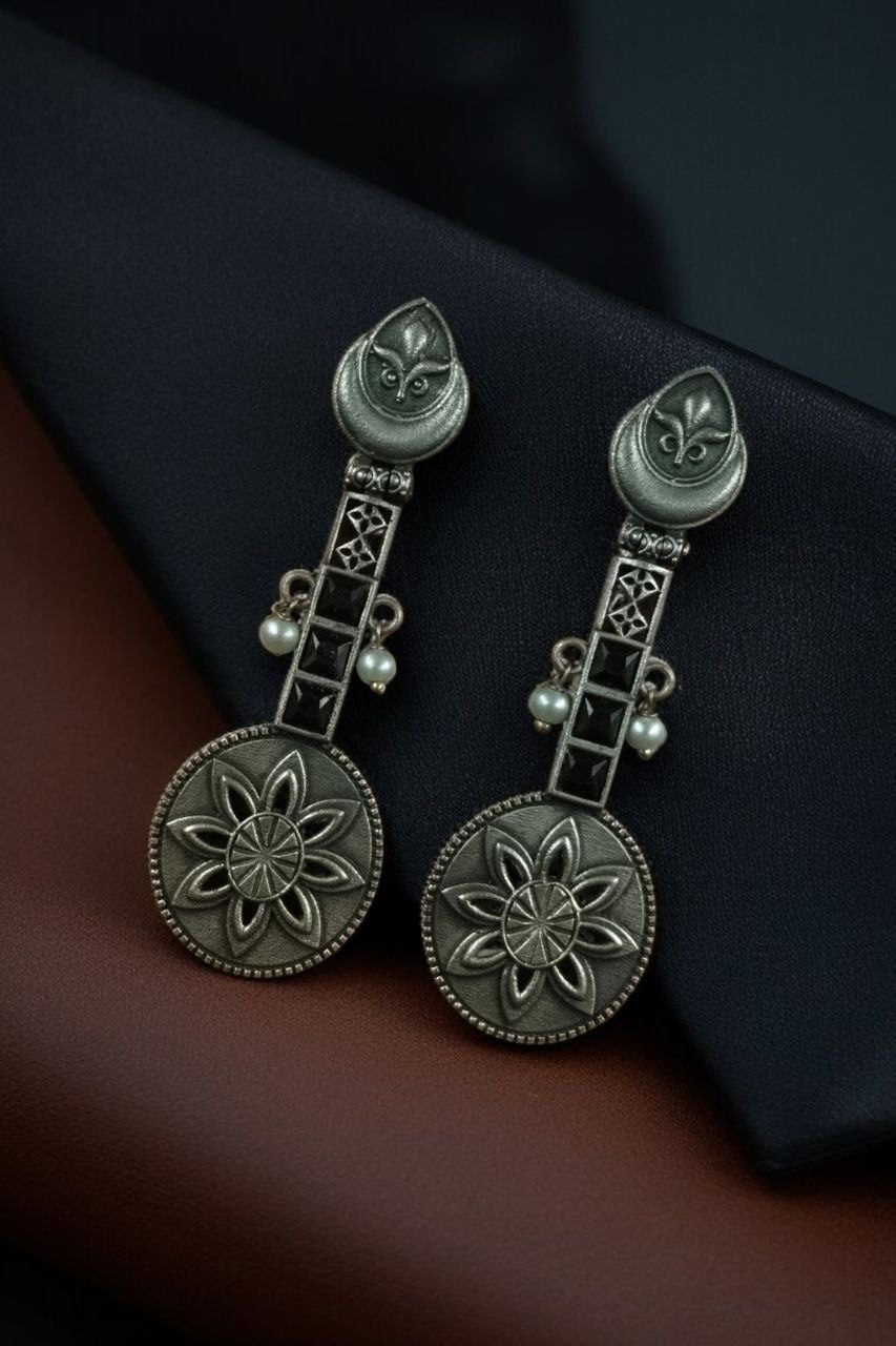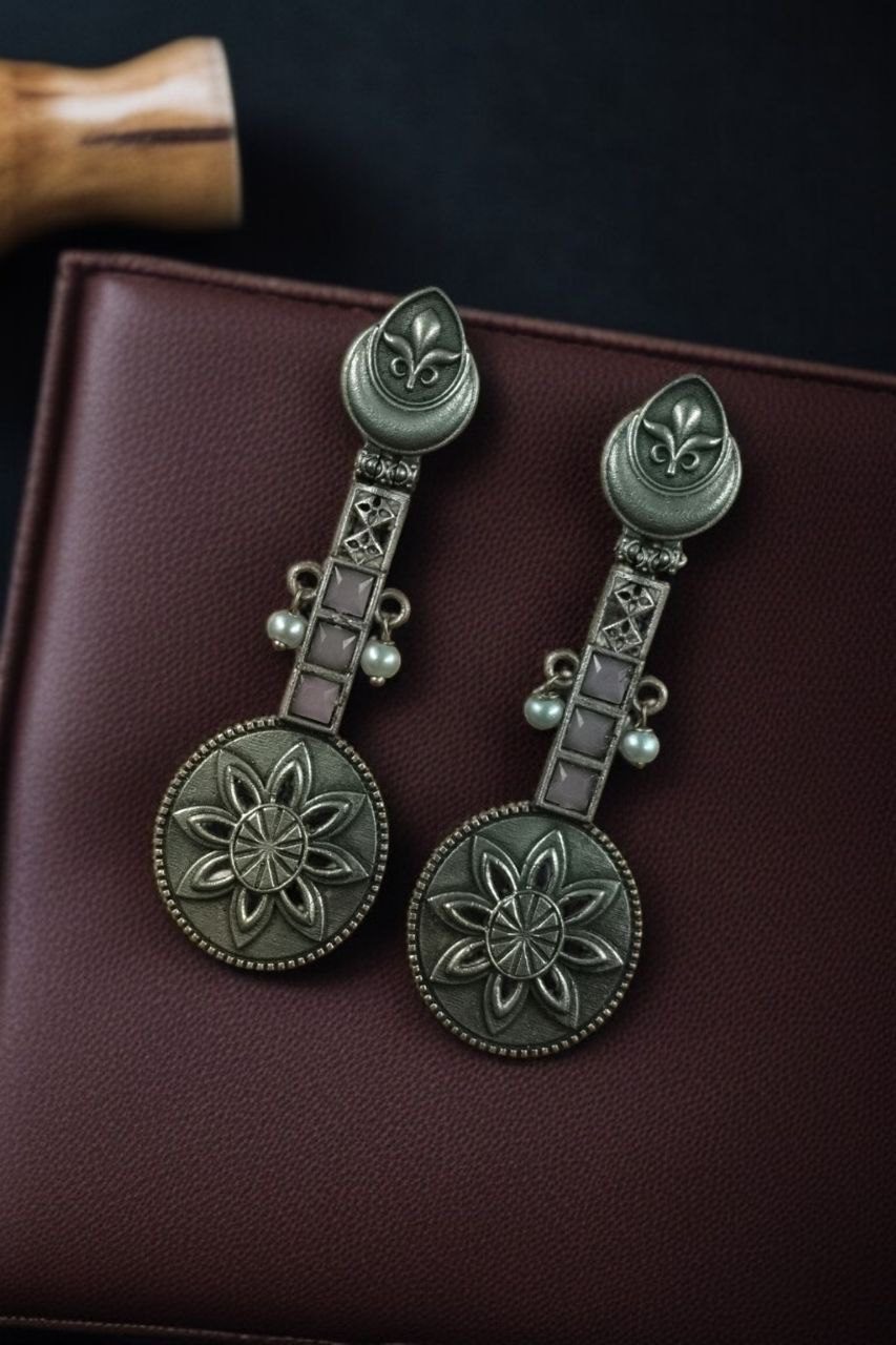 Elevate your ethnic style with our Lightweight Flower Dangler Earrings, beautifully handcrafted in silver plated oxidised finish with intricate pearl and stone work. Inspired by timeless floral motifs and traditional Indian aesthetics, these earrings offer the perfect balance of elegance, craftsmanship, and comfort.