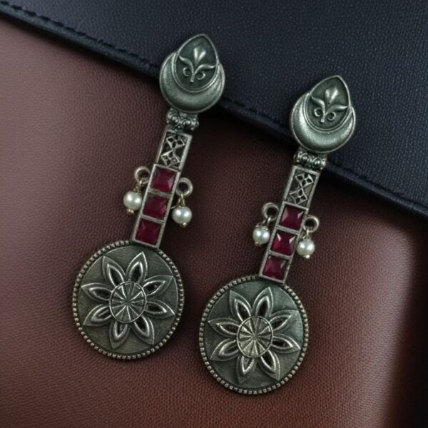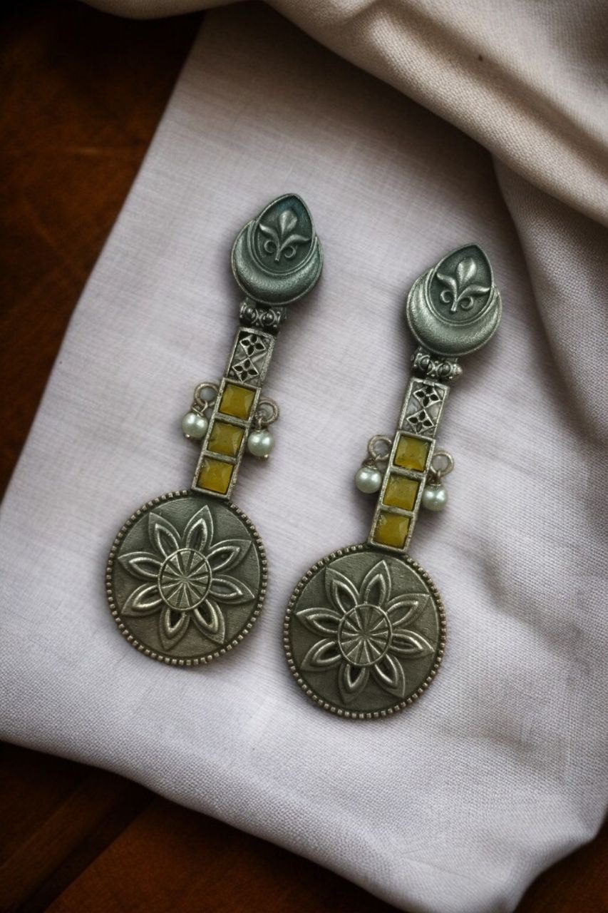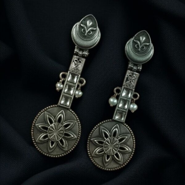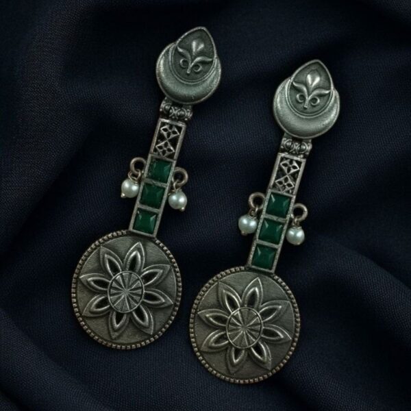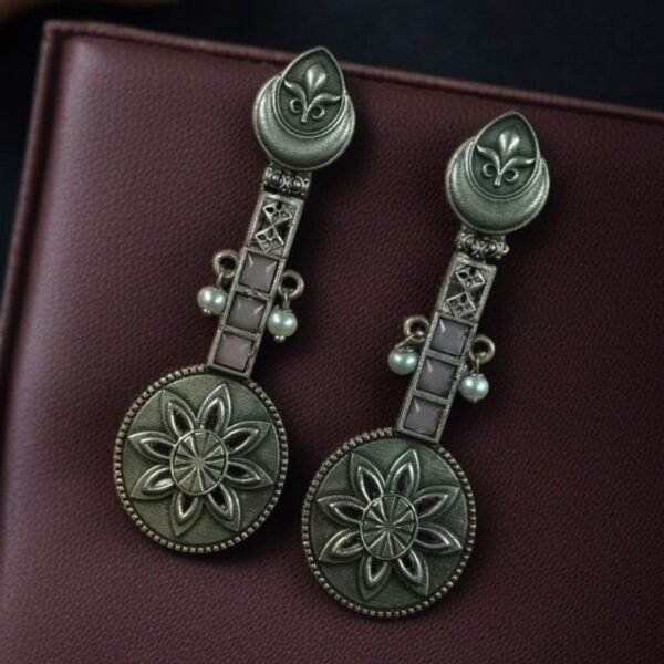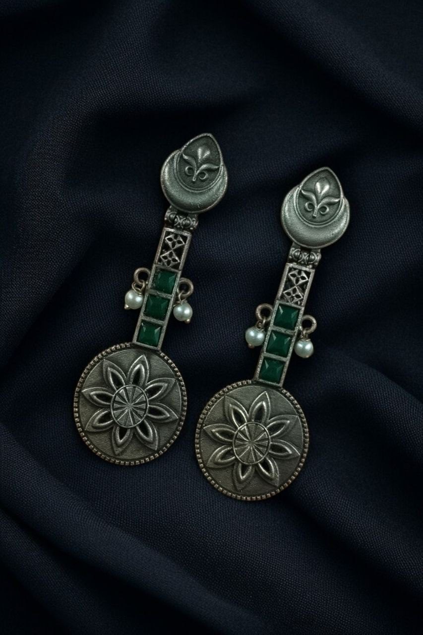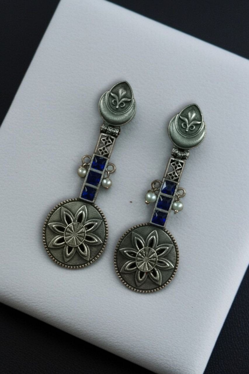 Elevate your ethnic style with our Lightweight Flower Dangler Earrings, beautifully handcrafted in silver plated oxidised finish with intricate pearl and stone work. Inspired by timeless floral motifs and traditional Indian aesthetics, these earrings offer the perfect balance of elegance, craftsmanship, and comfort.