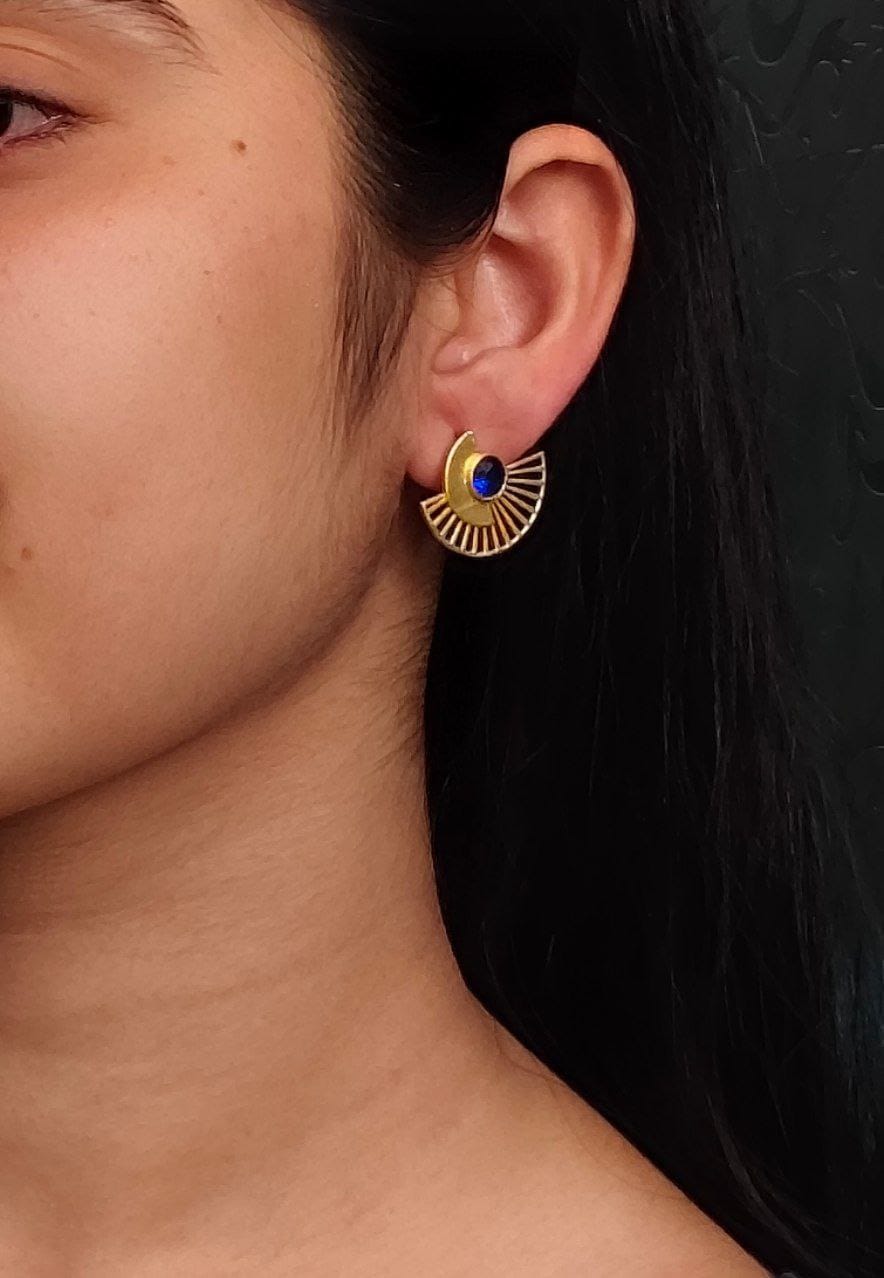 These earrings are adorned with vibrant blue stones, carefully set to enhance their striking beauty. The combination of round and teardrop-shaped stones creates a balanced yet eye-catching contrast. The deep blue hues bring a refreshing, oceanic vibe, making them a perfect choice for those who adore bold color elements in their accessories. Whether paired with summer pastels or winter neutrals, these earrings will complement any outfit flawlessly.