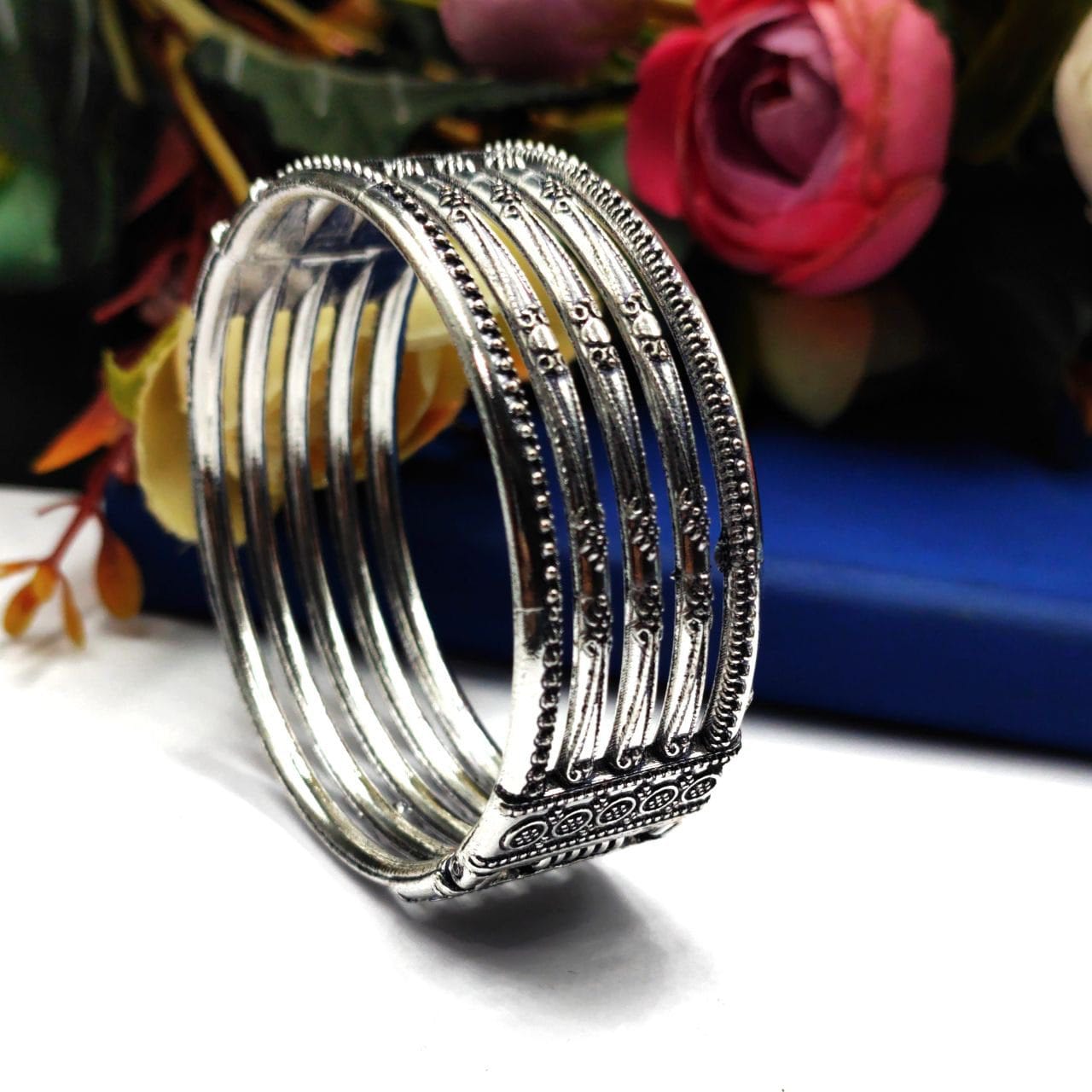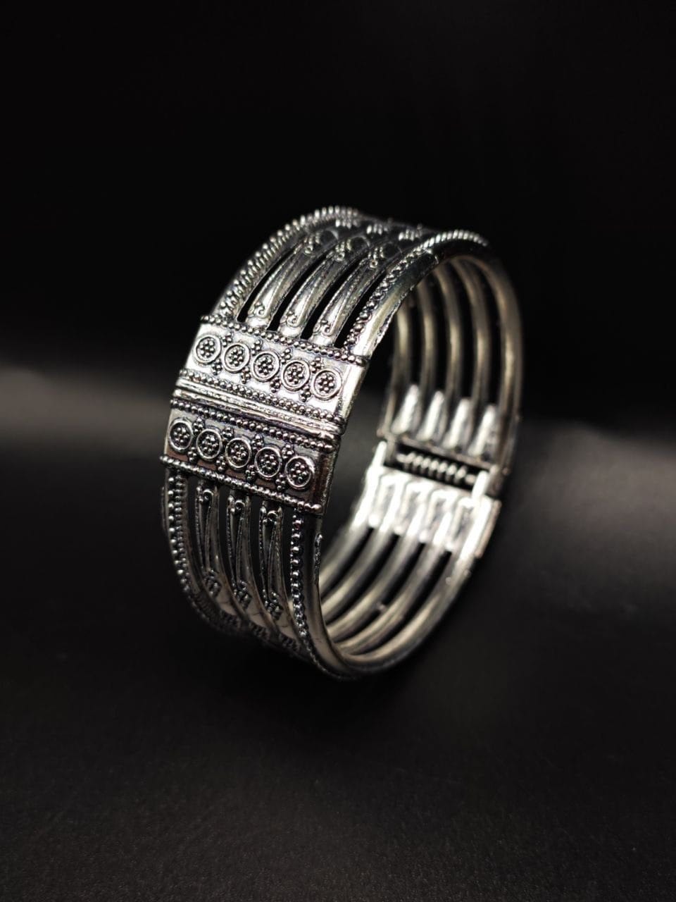 Introducing our Bangles collection of Oxidised German Silver Bracelet Design, handcrafted by D9creation. Each piece is a work of art, Our Silver Bangles are made from high-quality German Silver materials, ensuring durability and long-lasting beauty. The oxidized finish gives them a unique and distinctive look, with a dark patina that adds depth and character to the jewelry.