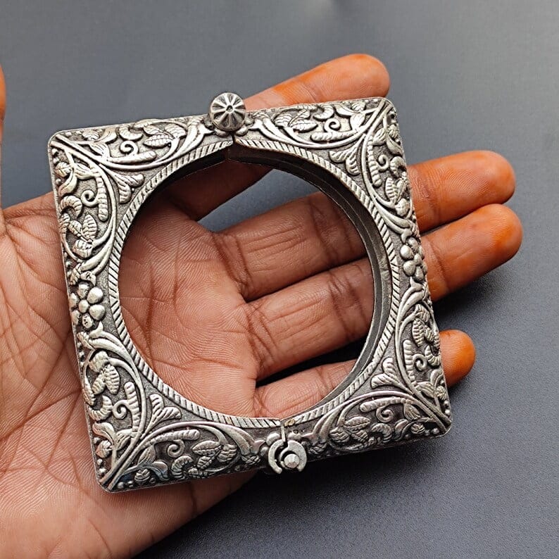 Introducing our collection of Silver Replica Oxidised Square Bangles / Kada With Free Size Openable Facilities, handcrafted with precision and care by D9creation. This Antique Touch Designer Bangle piece is a work of art, showcasing traditional craftsmanship and design.