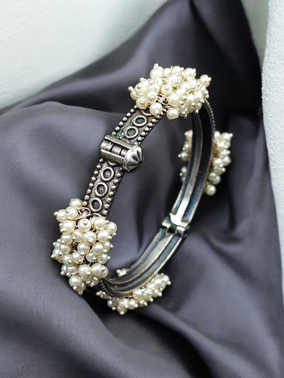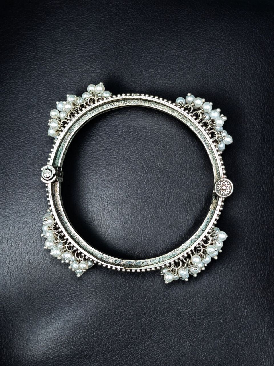 This bangle embodies the beauty of traditional craftsmanship with its oxidized finish, reminiscent of vintage silver jewelry. The meticulous detailing of floral and ethnic motifs is complemented by delicate pearl accents, creating a bracelet that radiates grace and sophistication. The openable design ensures ease of wear, making it perfect for all wrist sizes.
