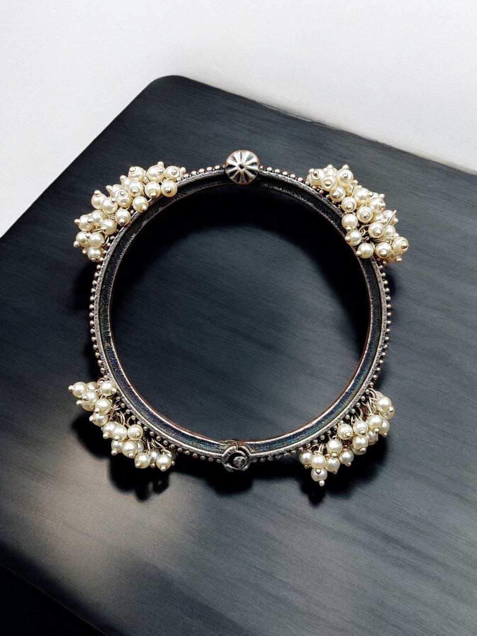Elevate your accessory game with our Oxidized Chudiya featuring the Best Openable Bangle design and Pearl Work Traditional Look Bracelet. Order now to embrace the perfect blend of tradition and style!