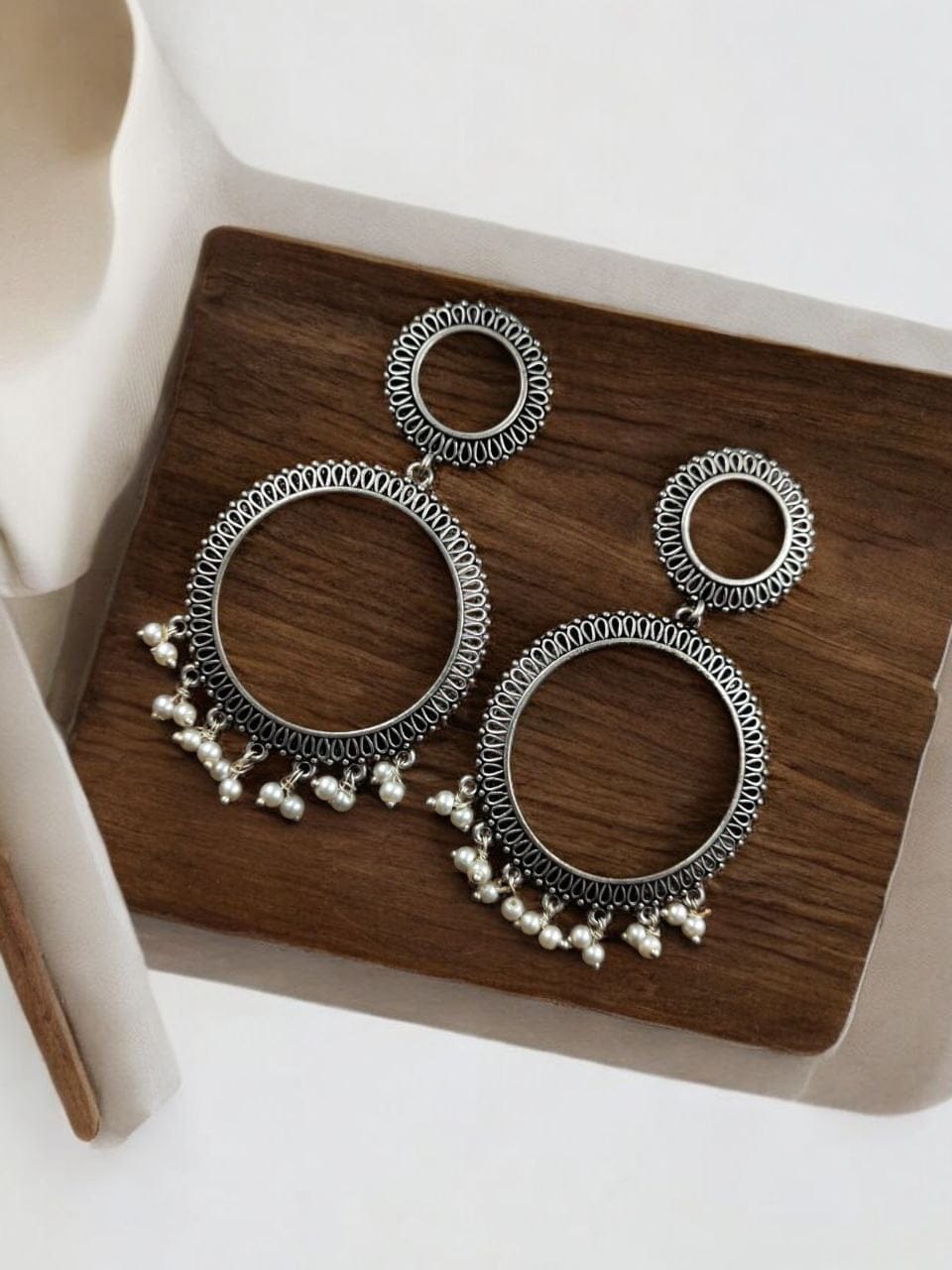 Elevate your style with our exquisite Oxidized Circle Earrings, masterfully crafted to offer a blend of modern elegance and timeless charm. These earrings are designed to make a statement, perfect for those who appreciate unique and meticulously crafted jewelry. Made from high-quality silver-plated brass, these danglers promise durability and a touch of sophistication to any outfit.