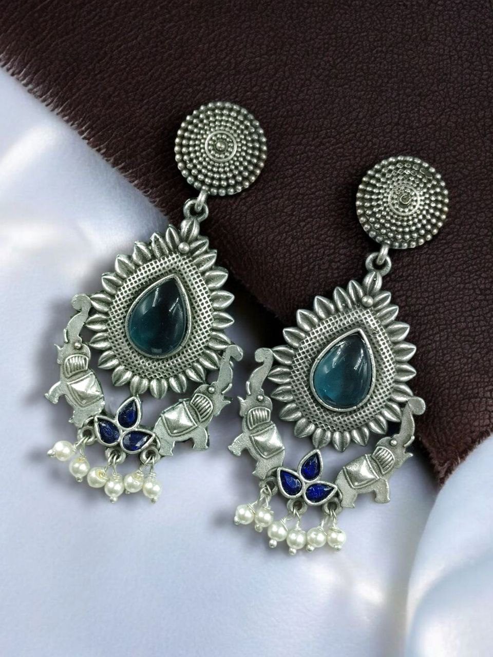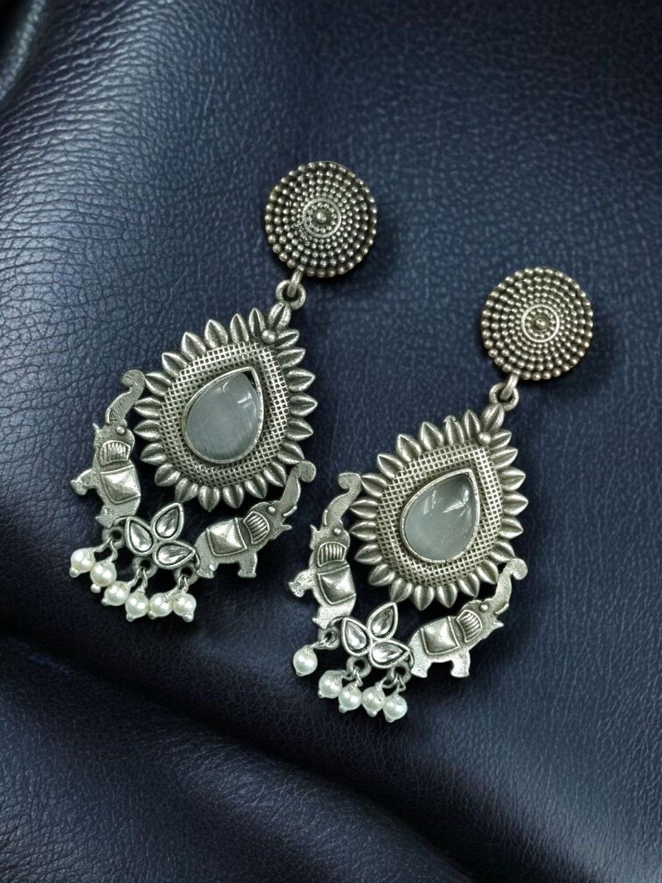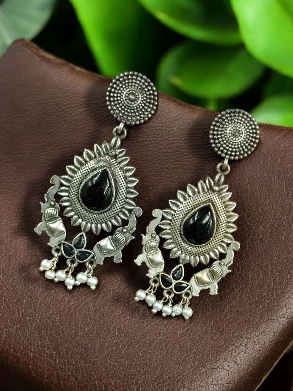The elephant, a symbol of strength, wisdom, and good fortune, takes center stage in this design. Meticulously carved in oxidized metal with fine detailing, the elephant motif lends a rustic and heritage-rich appeal to the earrings, making them an ideal accessory for traditional occasions, festive events, or even a fusion fashion statement.