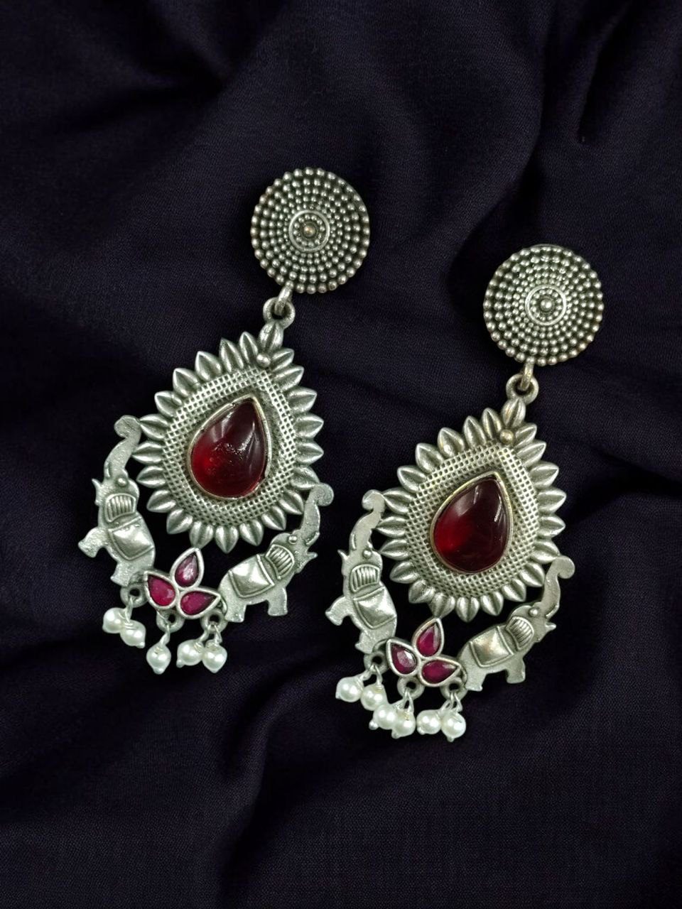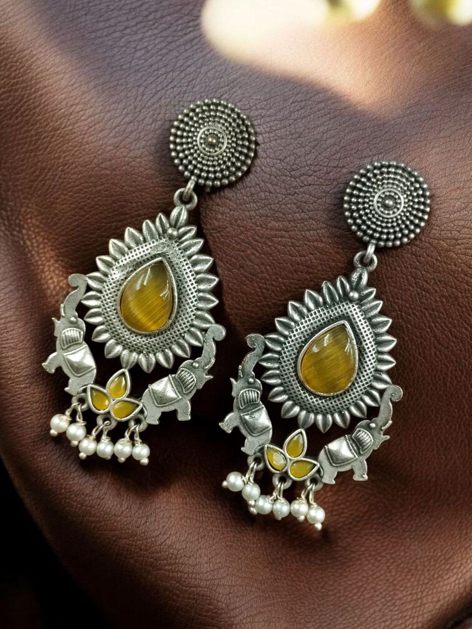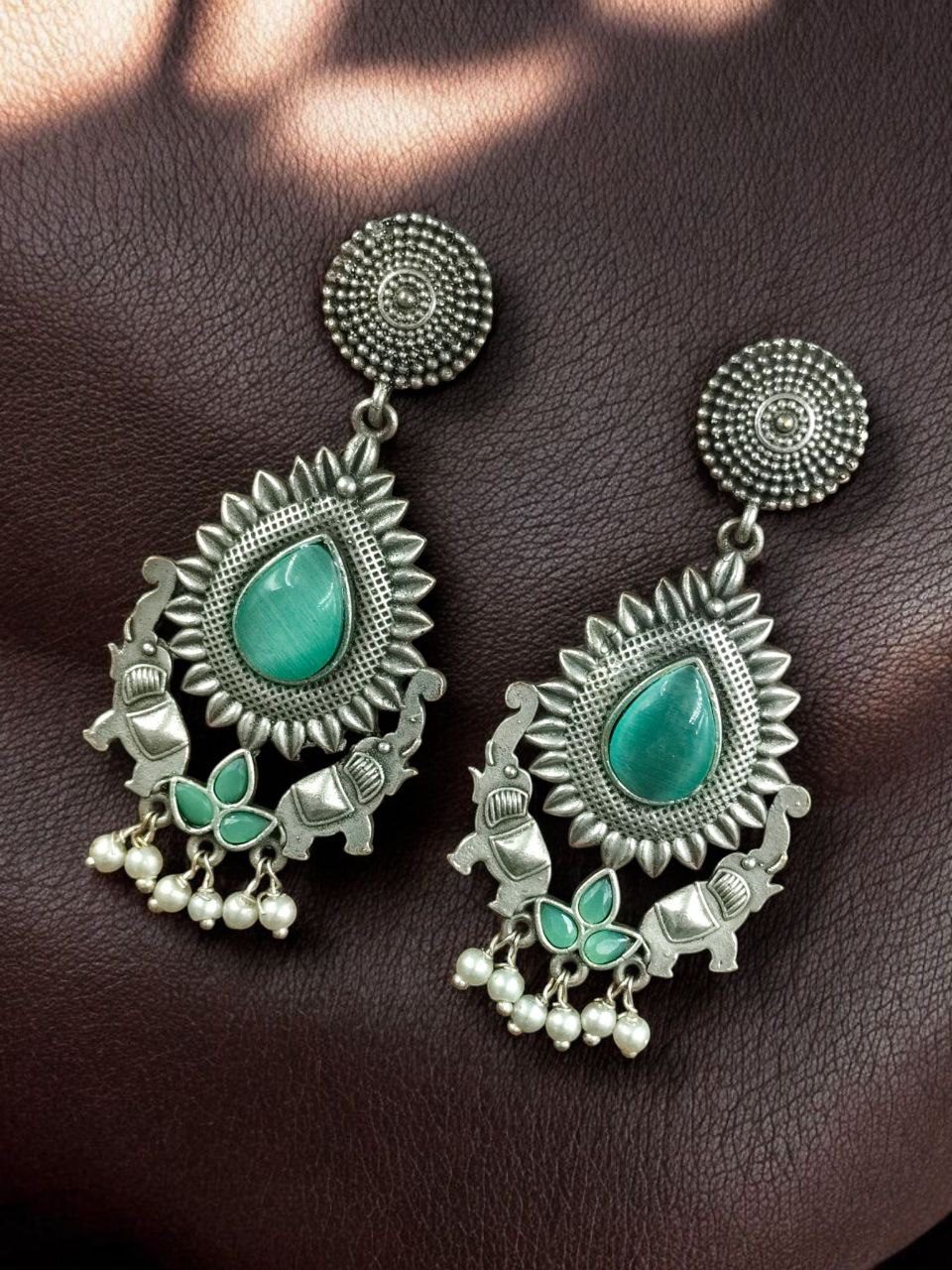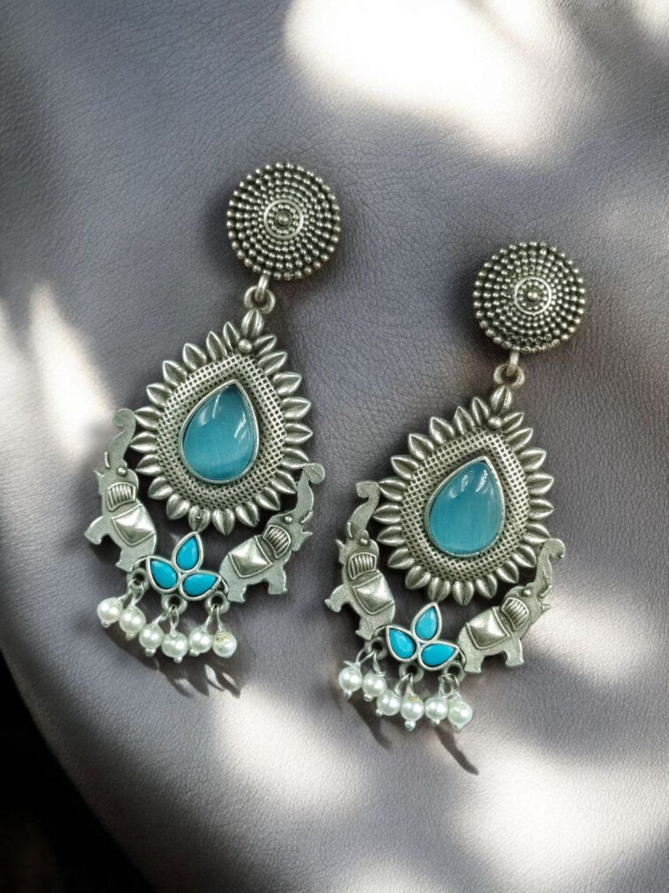 The elephant, a symbol of strength, wisdom, and good fortune, takes center stage in this design. Meticulously carved in oxidized metal with fine detailing, the elephant motif lends a rustic and heritage-rich appeal to the earrings, making them an ideal accessory for traditional occasions, festive events, or even a fusion fashion statement.