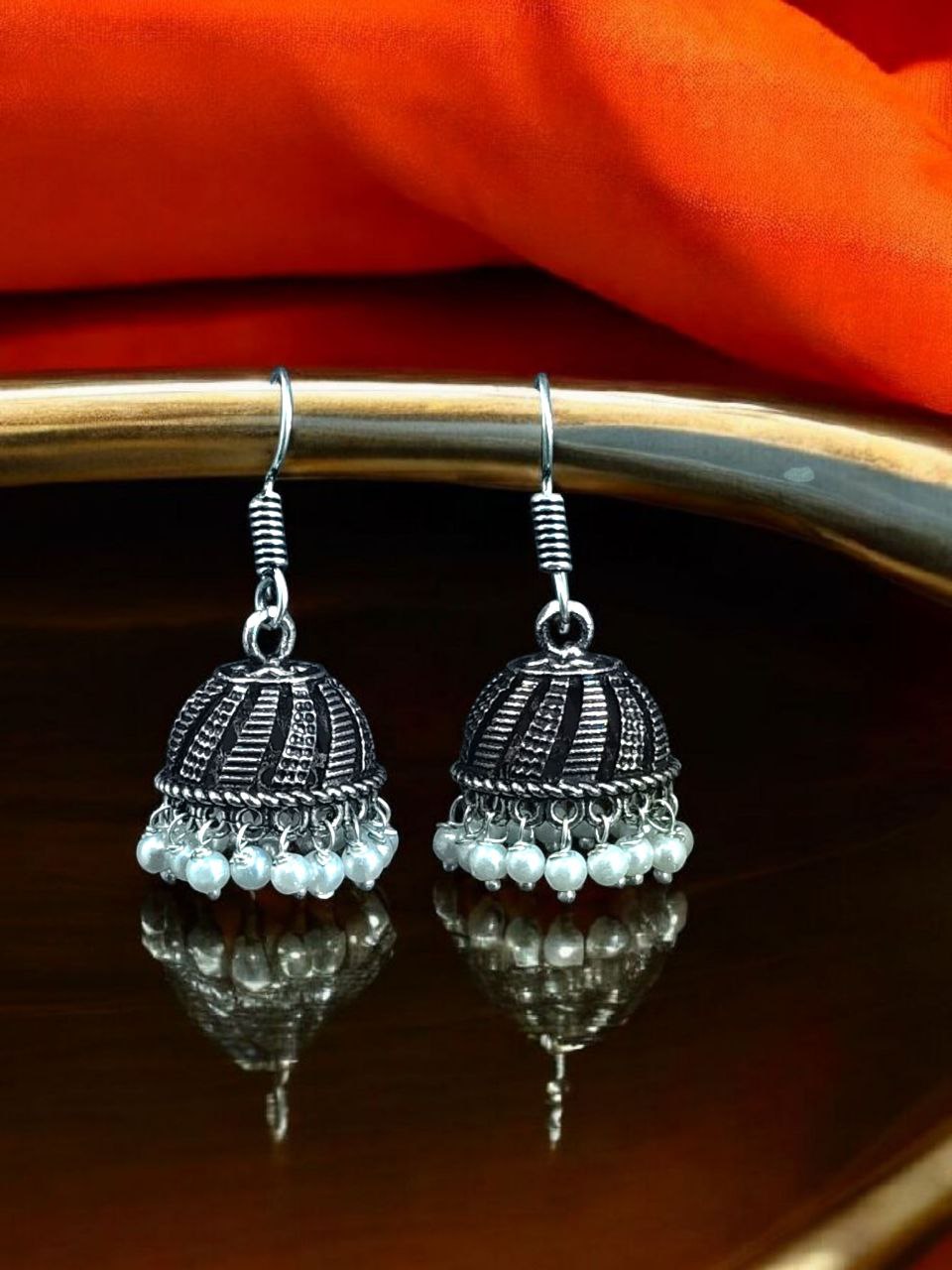 Adorned with pearl work detailing, these jhumkis bring an elegant balance between sophistication and ethnic charm. The pearls lend a soft, feminine touch, while the oxidized German silver base ensures durability and long-lasting shine. The hook design offers ease of wearing, making them lightweight and comfortable for long hours?ideal for daily wear as well as special gatherings.