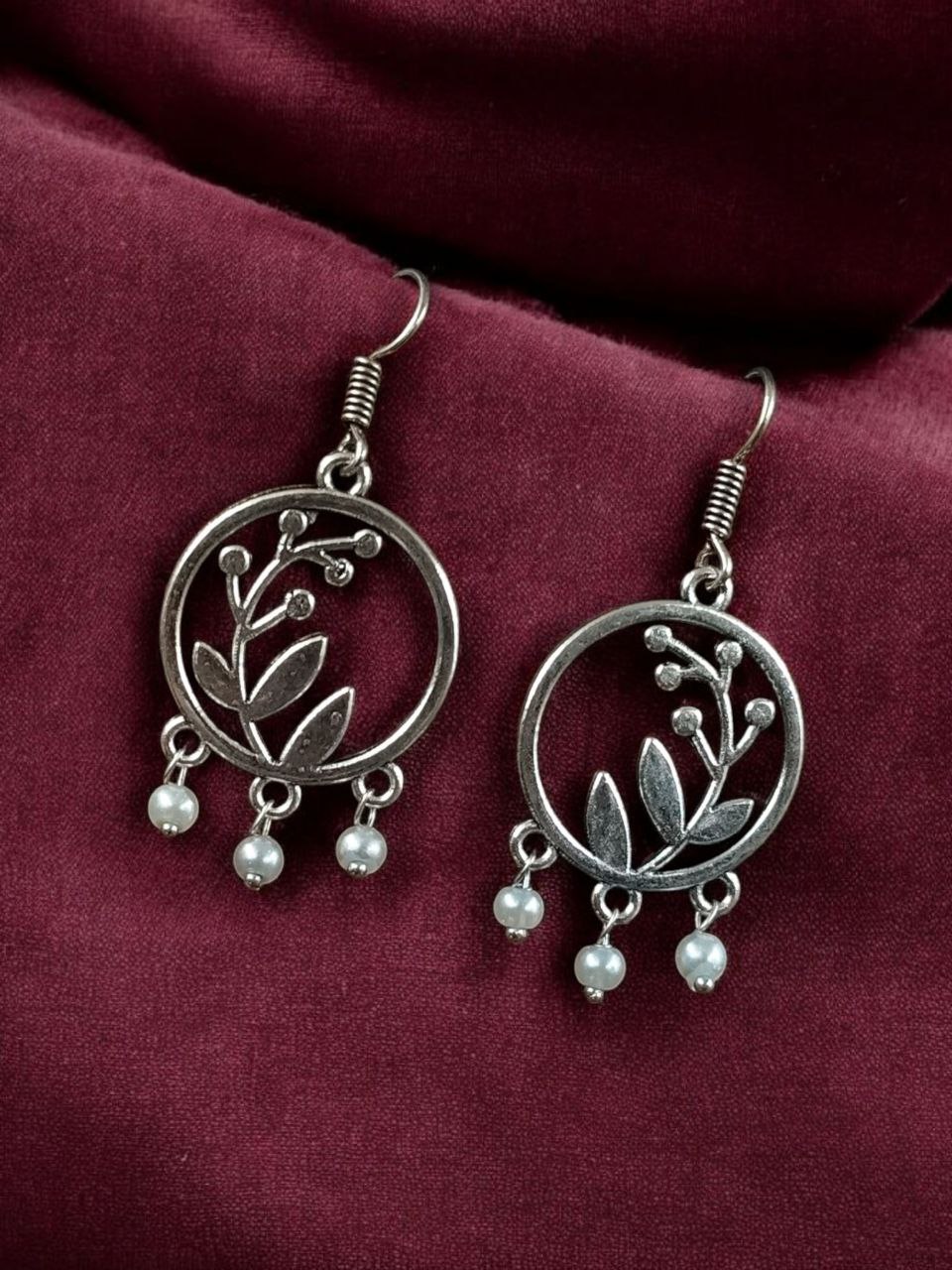 The earrings feature a beautiful combination of leaf and circle motifs, symbolizing harmony and natural beauty. The oxidized finish gives them a timeless antique appeal, making them versatile enough to pair with both ethnic and western outfits. Designed with precision, the hook dangler style ensures easy wear and a comfortable fit throughout the day.