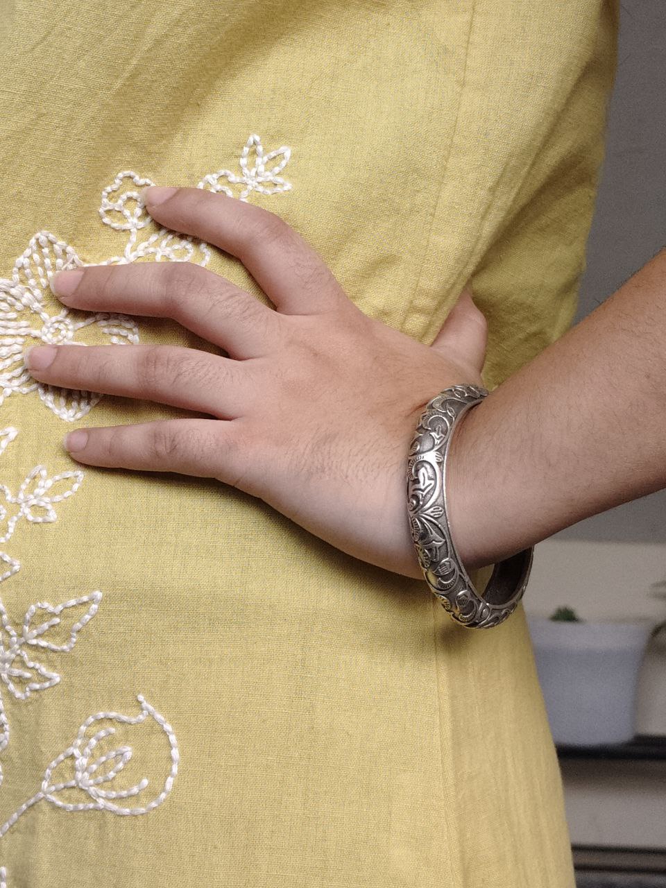 Handcrafted by skilled artisans, the bangle features delicate floral patterns carved into a durable silver replica metal base. The oxidized detailing highlights every petal and curve, giving it a timeless antique appeal. Whether you’re dressing up for a festive occasion, cultural celebration, wedding event, or simply adding charm to your everyday look, this floral art bangle is the perfect choice.