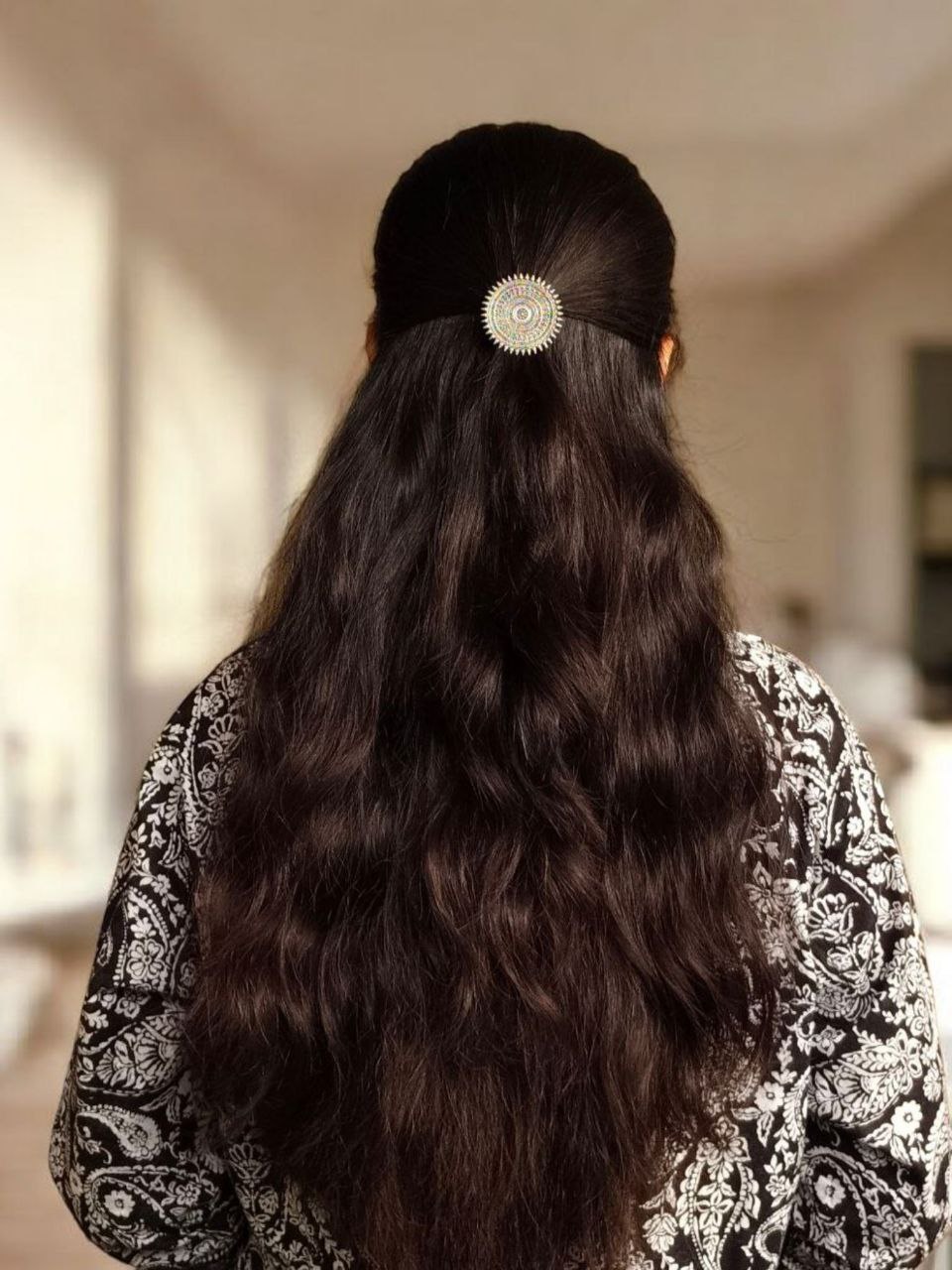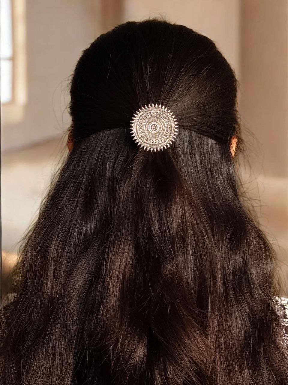 Lightweight and comfortable, the silver replica oxidized finish ensures durability and long-lasting shine, even with regular use. Its smooth metal build ensures it slides easily into your hair without tugging, pulling, or causing discomfort. The sturdy grip keeps your hairstyle in place throughout the day, making it ideal for school, college, office, casual outings, or simple everyday wear.