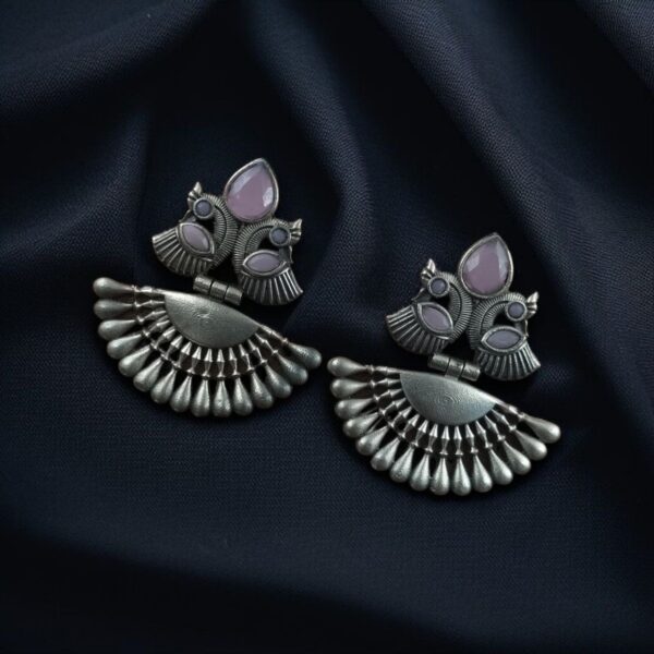 Each earring features an intricately designed peacock motif, symbolizing grace and beauty. The oxidized silver plating imparts a vintage charm, enhancing the intricate details. Adorned with vibrant stones and delicate pearl accents, these danglers catch the light with every movement, adding a subtle yet captivating sparkle..bebeatnik.com+2deodap.in+2yellowchimes.com+2
