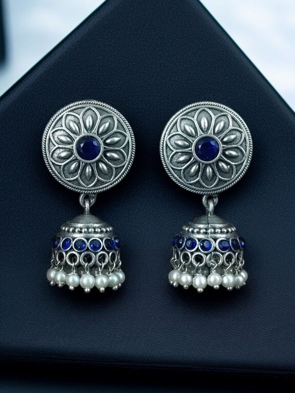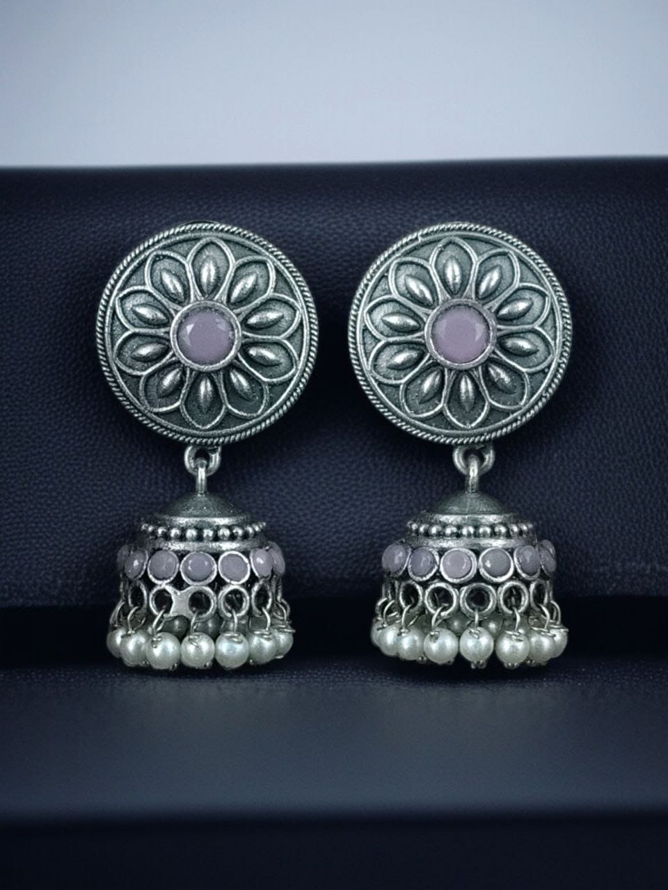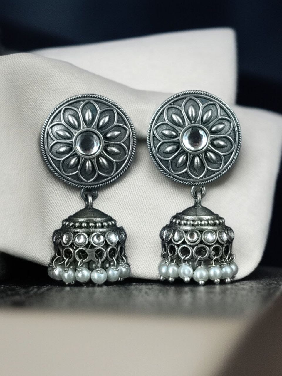 Crafted with a fine oxidized silver finish, these jhumki earrings capture the richness of traditional jewelry in a contemporary design. The intricate floral pattern is enhanced with carefully embedded sparkling stones, adding a hint of shimmer without being overpowering. The delicate pearl danglings at the base create a soft, graceful movement that adds femininity and charm to your overall look.