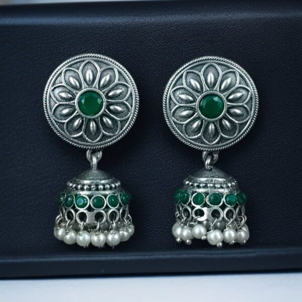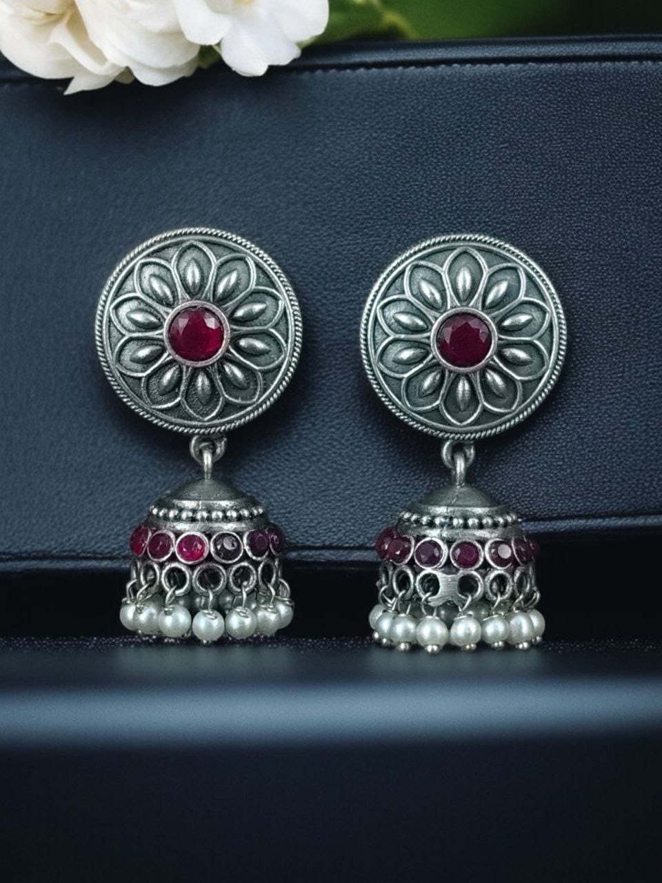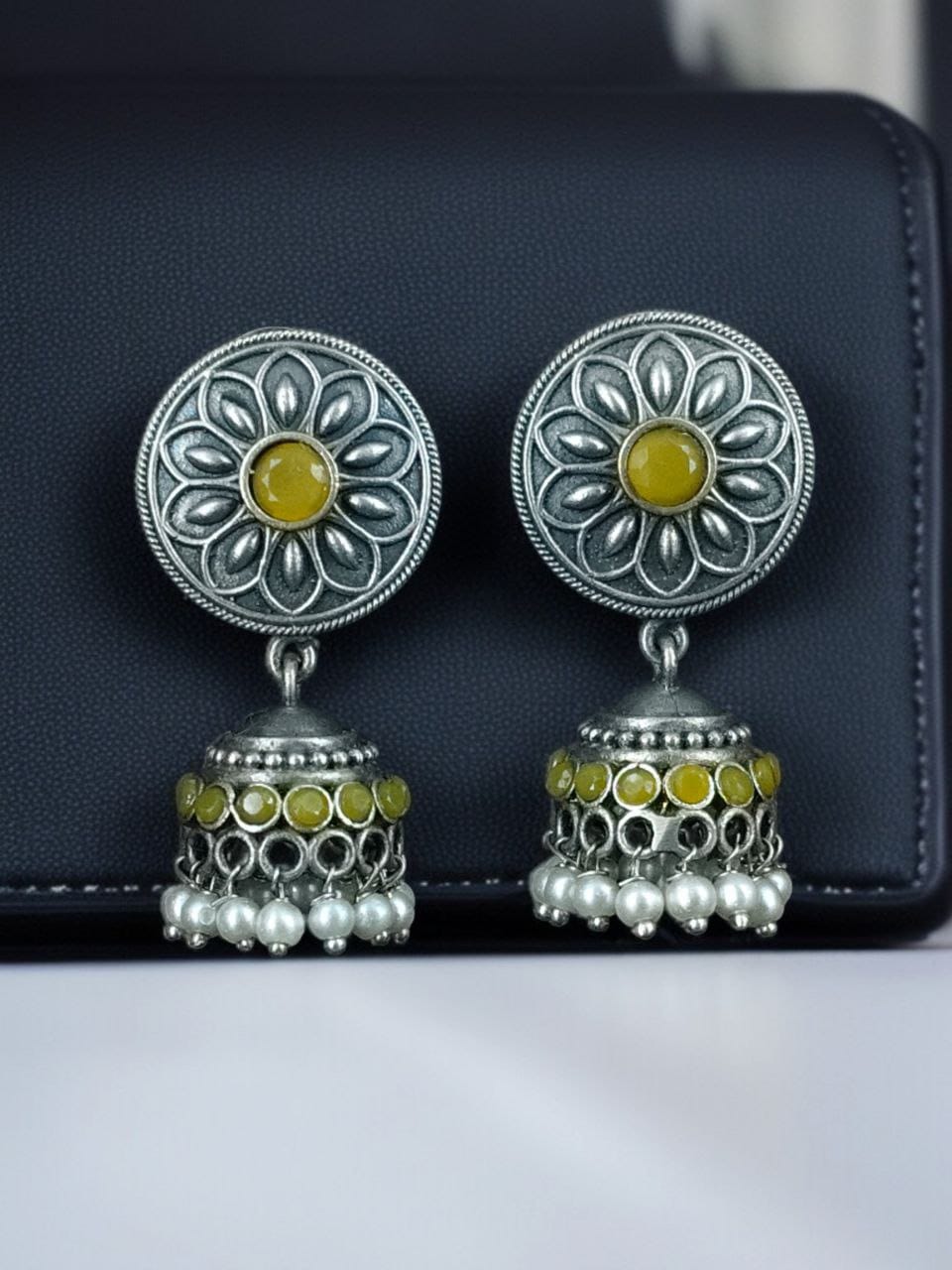 Crafted with a fine oxidized silver finish, these jhumki earrings capture the richness of traditional jewelry in a contemporary design. The intricate floral pattern is enhanced with carefully embedded sparkling stones, adding a hint of shimmer without being overpowering. The delicate pearl danglings at the base create a soft, graceful movement that adds femininity and charm to your overall look.