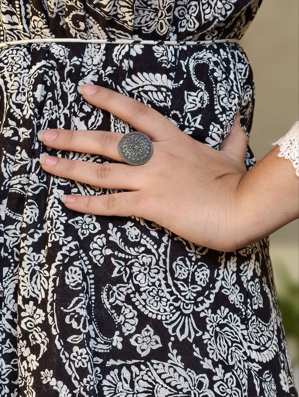 Versatile in styling, this flower design ring pairs effortlessly with ethnic outfits like sarees and kurtis, as well as modern and fusion wear. You can wear it alone for a minimal, elegant look or pair it with other oxidized silver jewelry for a coordinated style. Its classic design makes it suitable for women and girls of all age groups.