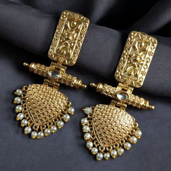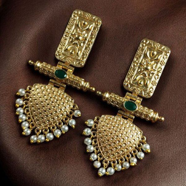 Made from high-quality brass and finished with rich gold plating, these earrings reflect luxury and durability. The gold plating gives them a radiant shine, closely mimicking the look of pure gold while remaining lightweight and comfortable for all-day wear. The detailing is inspired by classic Indian motifs, making these earrings a beautiful reflection of heritage with a contemporary twist.