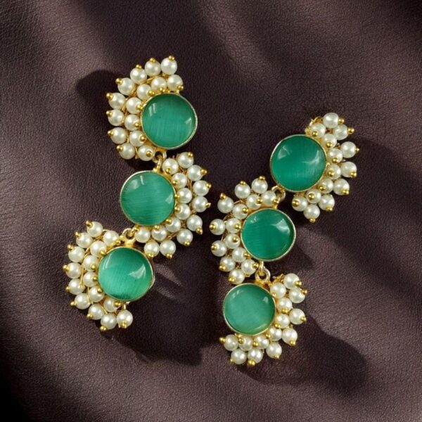 The centerpiece of these earrings is the exquisite Monalisa stone, known for its soft luster, dreamy color tones, and polished finish. Set with precision, the Monalisa stone catches light beautifully, giving off an ethereal shimmer that adds subtle glamor without being overpowering. Whether you’re attending a festive celebration, a formal gathering, or a casual outing, these earrings adapt seamlessly to every occasion.