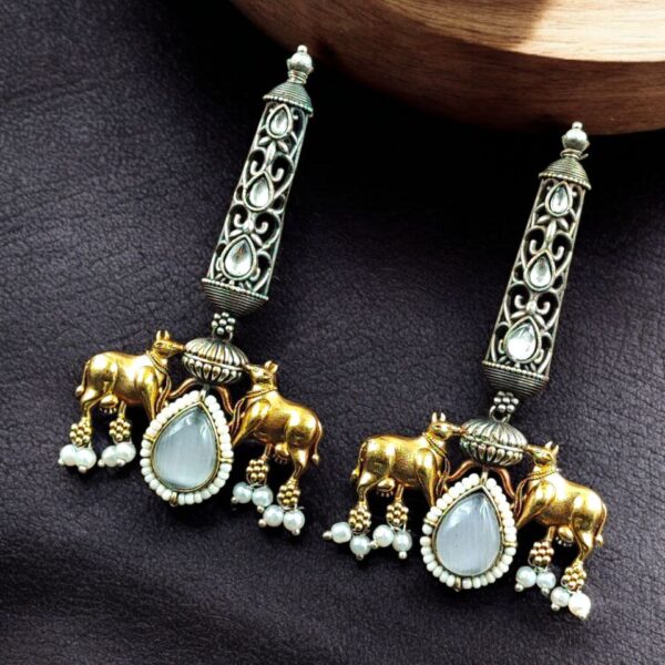 The earrings feature a finely crafted Nandi motif, symbolizing strength, devotion, and positivity. Nandi, known as the sacred companion of Lord Shiva, adds a meaningful and auspicious touch to the design. The two-tone finish enhances the intricate details, creating a striking contrast that highlights the craftsmanship and gives the earrings a premium, antique-inspired appearance.