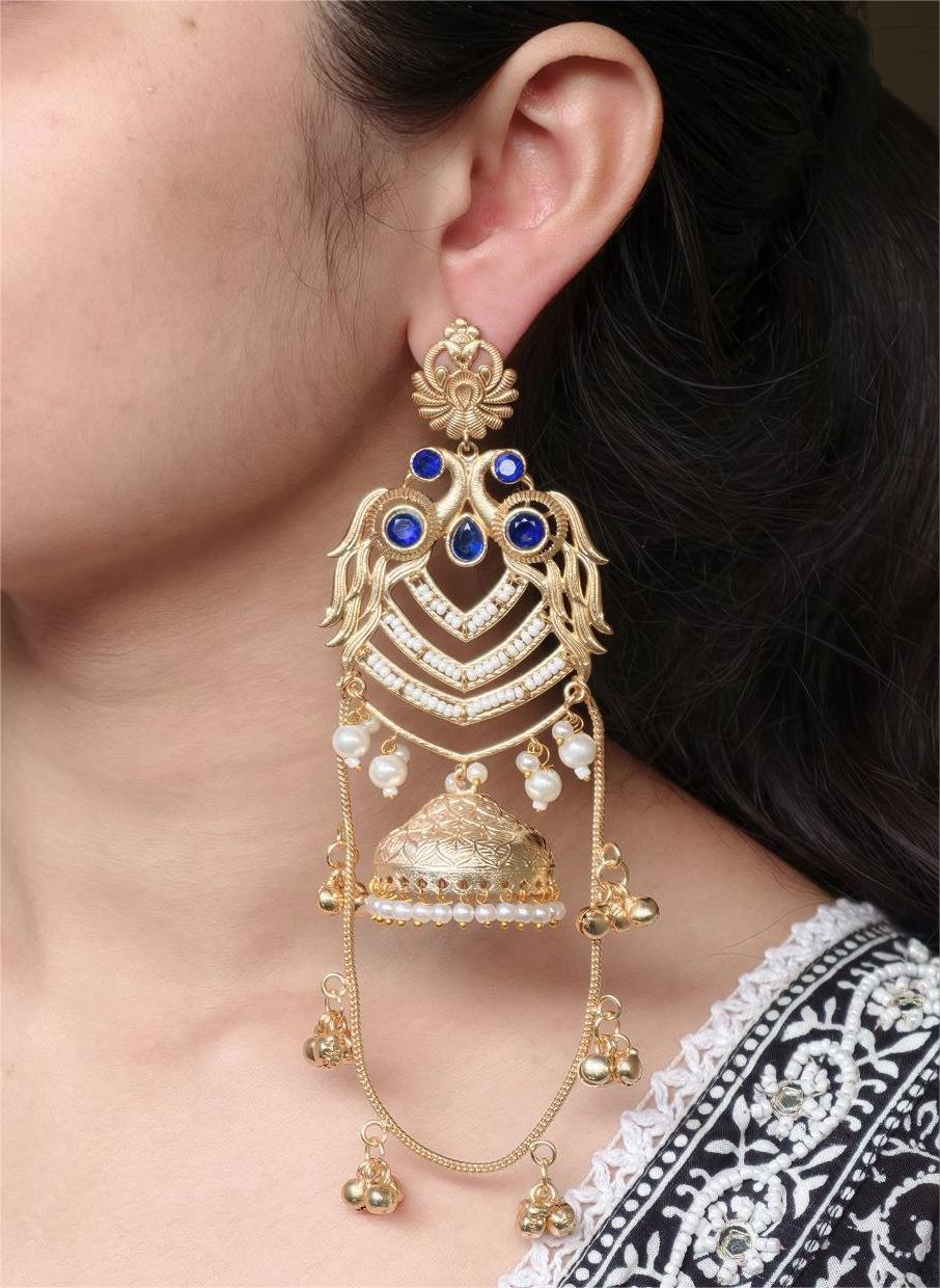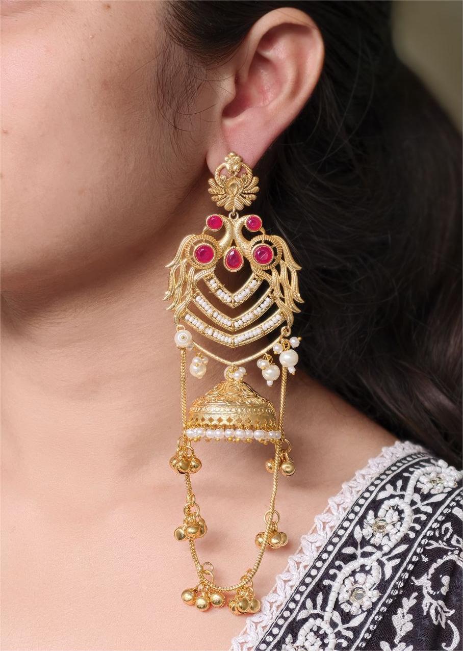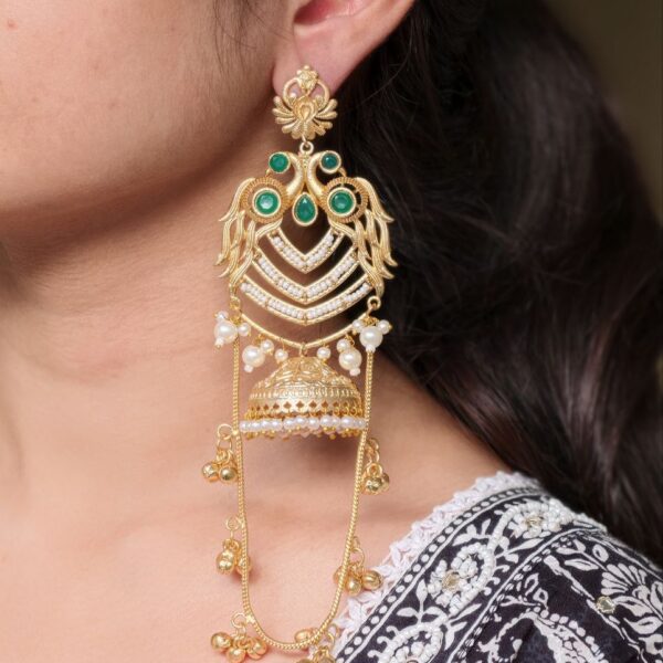 The earrings feature a beautifully detailed peacock design at the top, symbolizing grace, prosperity, and cultural richness. The peacock motif flows seamlessly into the classic Kashmiri-style jhumka, adorned with intricate detailing that adds depth and charm. The gold plated polish enhances the overall look, giving the earrings a luxurious shine that closely resembles traditional gold jewelry.