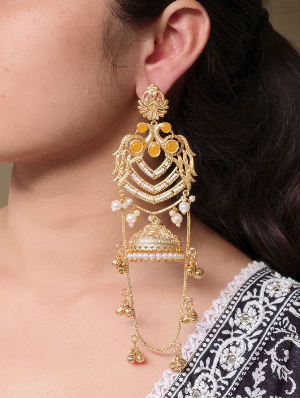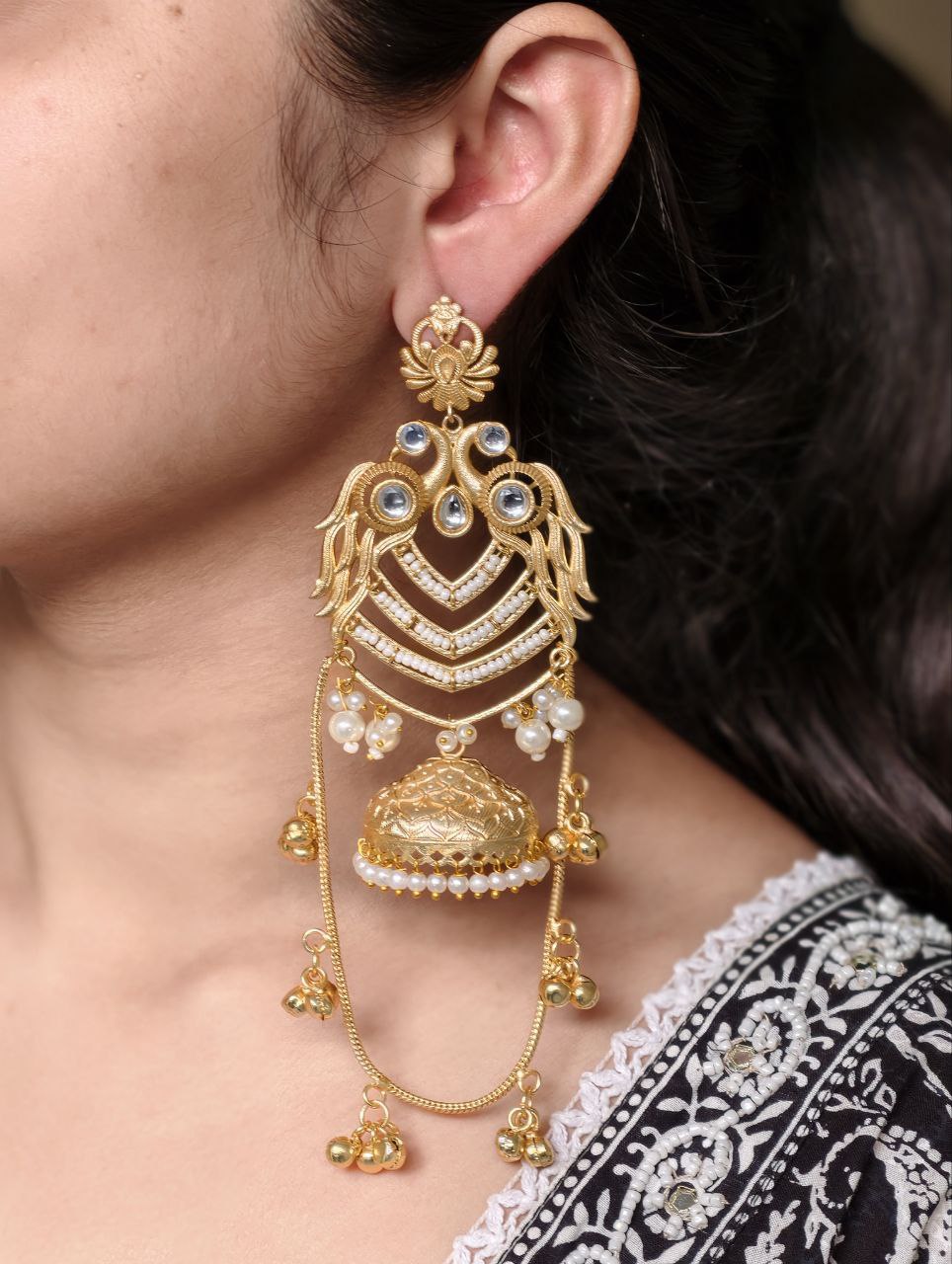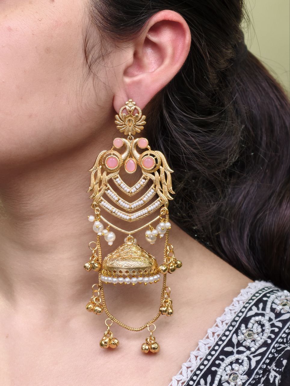 The earrings feature a beautifully detailed peacock design at the top, symbolizing grace, prosperity, and cultural richness. The peacock motif flows seamlessly into the classic Kashmiri-style jhumka, adorned with intricate detailing that adds depth and charm. The gold plated polish enhances the overall look, giving the earrings a luxurious shine that closely resembles traditional gold jewelry.