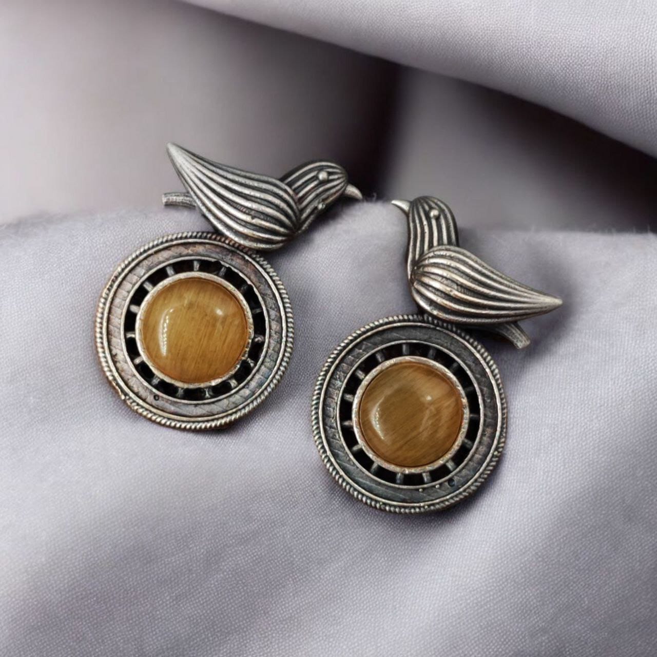 Introducing the Silver Look-alike Oxidized Bird Stud Earrings with Stunning Monalisa Stone ? a perfect blend of vintage charm and contemporary elegance. These earrings feature a unique design that brings together the mystique of oxidized silver with the captivating beauty of the Monalisa stone, making them an ideal choice for anyone who appreciates the artistry of handcrafted jewelry.