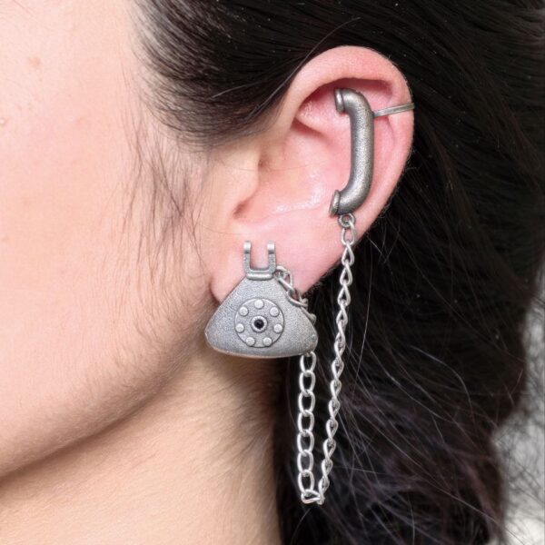 Crafted from high-quality alloy and finished with premium silver replica plating, this oxidized earcuff offers a rich antique look that complements both ethnic and fusion outfits. The detailed telephone design adds a playful yet elegant twist, making it a perfect accessory for those who enjoy standing out with distinctive jewelry pieces.