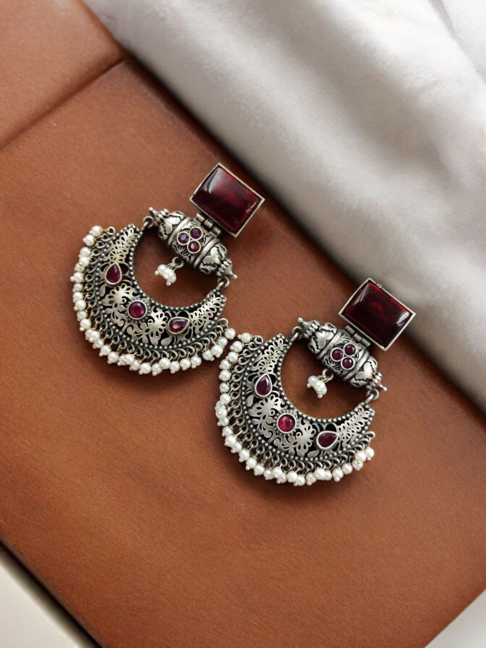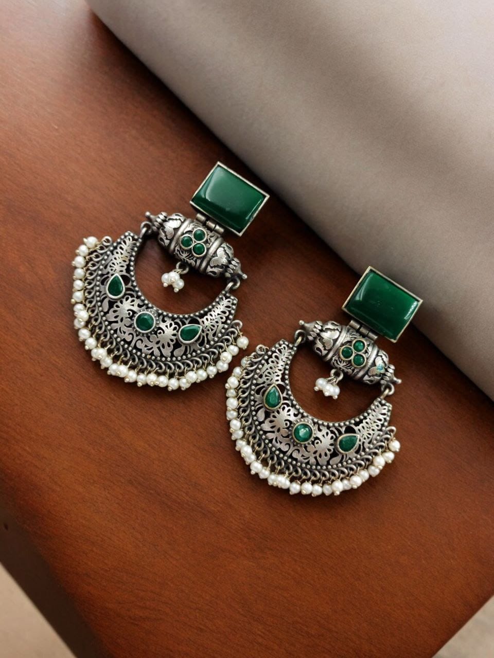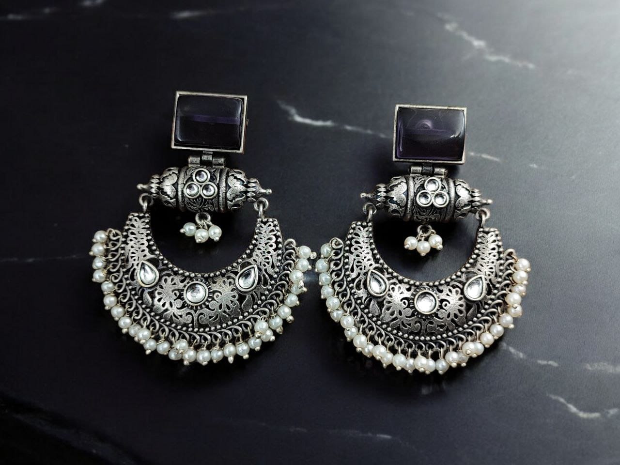 One of the standout features of our Silver Replica Chandbali Earrings is their versatility. The unique combination of traditional Chandbali design and contemporary square stone stud makes these earrings a perfect match for a variety of outfits. Pair them with a traditional saree or lehenga for a festive occasion, or add a touch of elegance to your casual wear with these statement earrings.