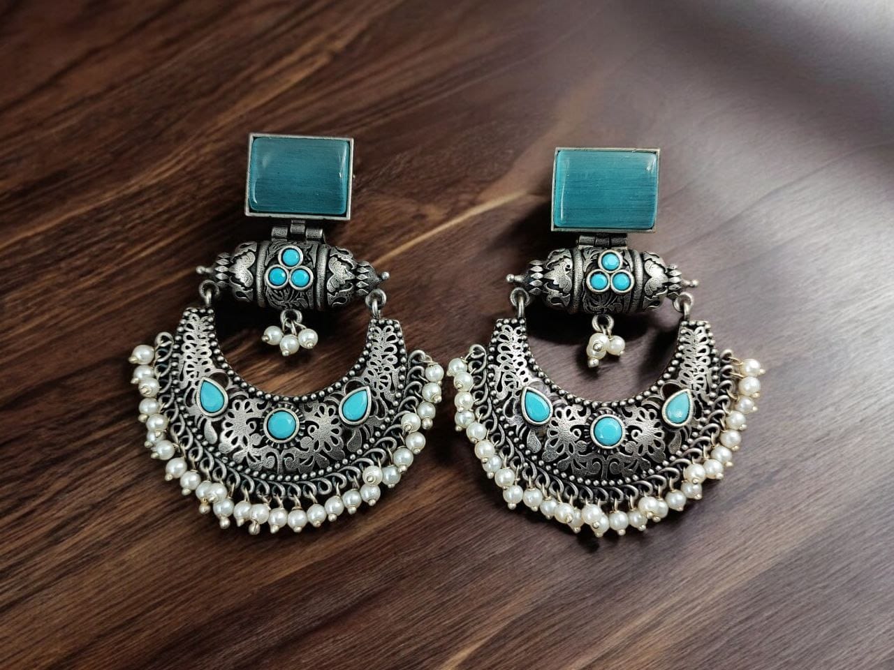 These Silver Look-Alike Earrings are crafted from high-quality silver look-alike materials, offering the beauty and luster of real silver without the high cost. The durable construction ensures that these Chandbali Dangler Earrings remain stunning and intact even with regular use. The hypoallergenic materials make these Silver Replica Chandbali suitable for all skin types, providing comfort without sacrificing style.
