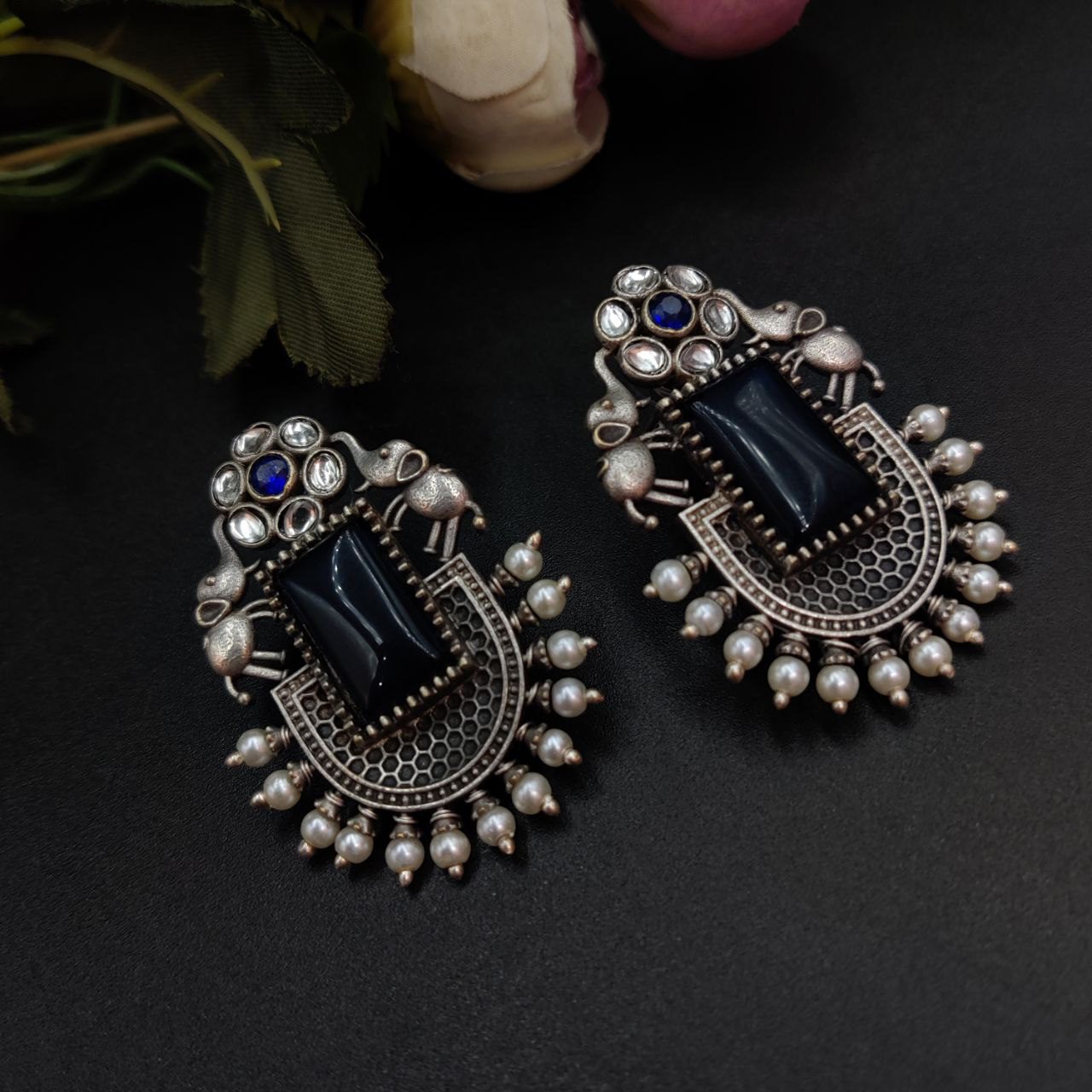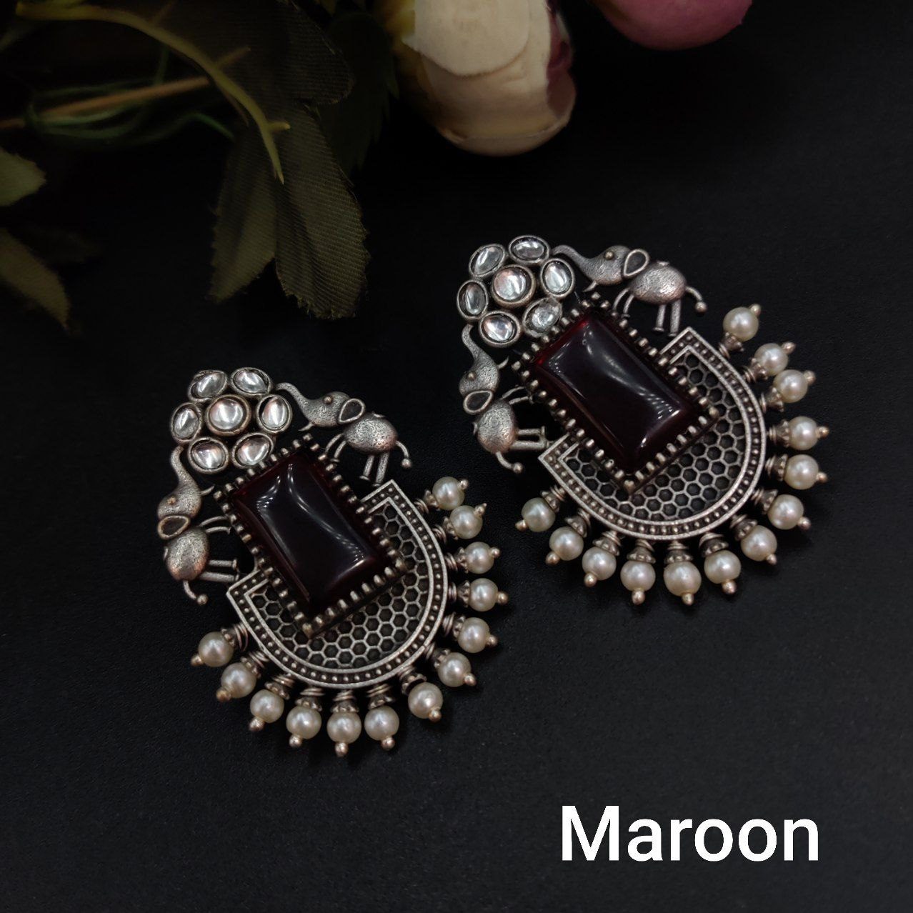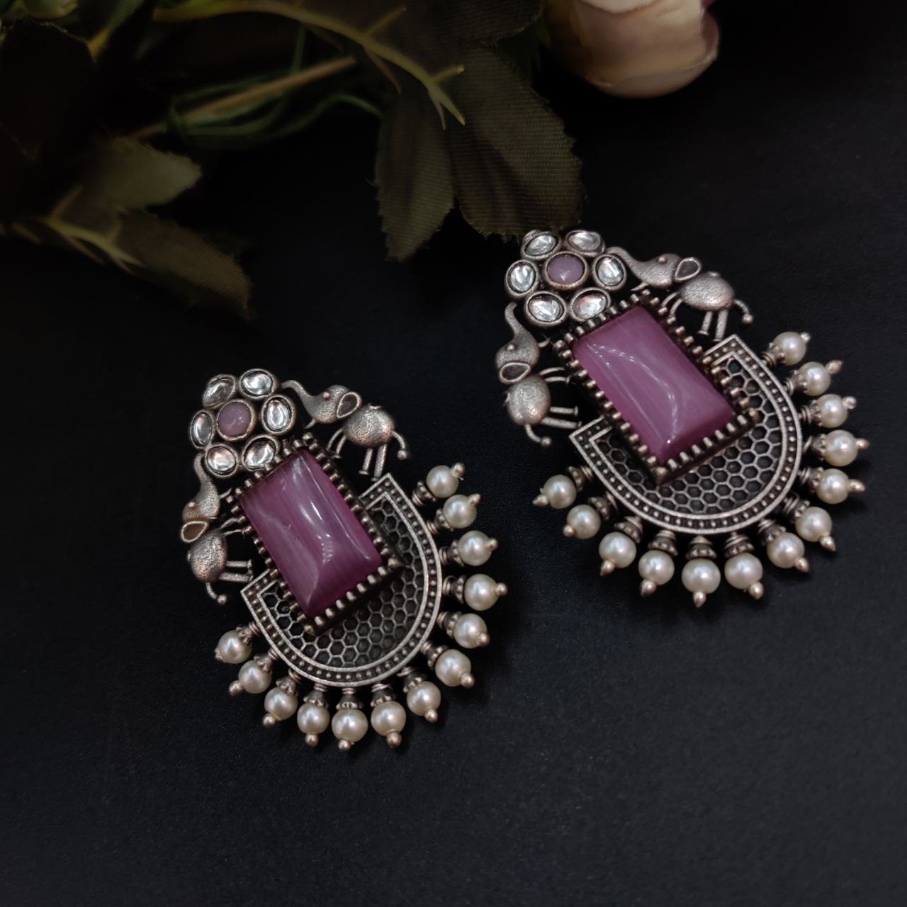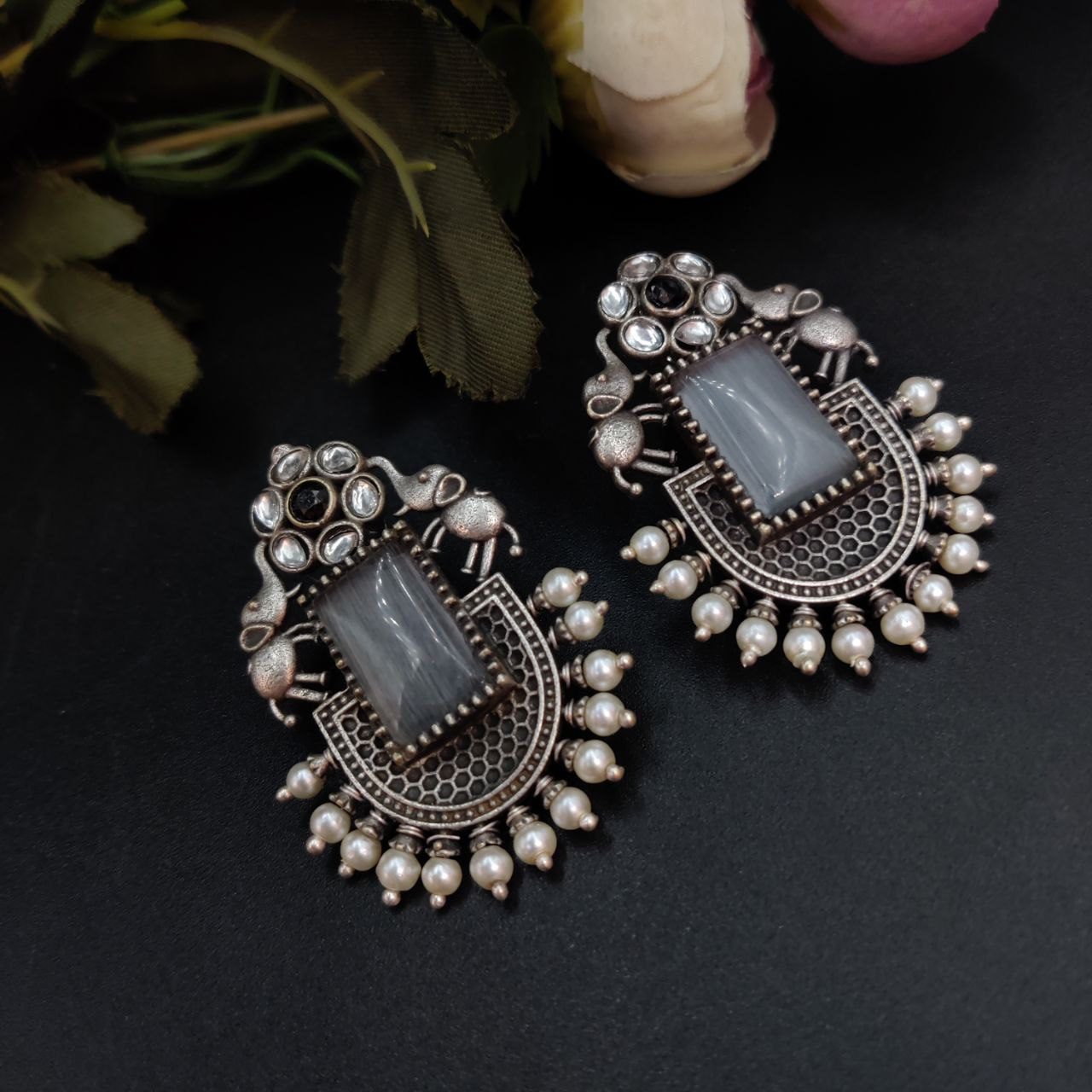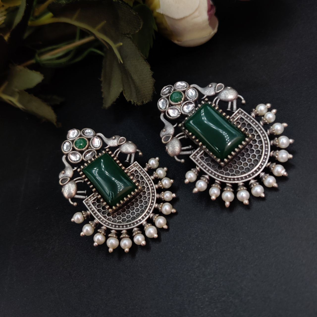 These silver replica Elephant Studs Earrings are crafted from high-quality materials, featuring a finely detailed elephant design that stands out beautifully against any backdrop. The oxidized finish enhances the intricate details, giving them a vintage charm that pairs seamlessly with both ethnic and modern outfits. Lightweight and comfortable, they are perfect for everyday wear or for adding a touch of elegance to your special occasions.