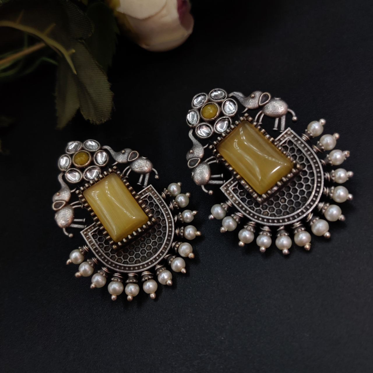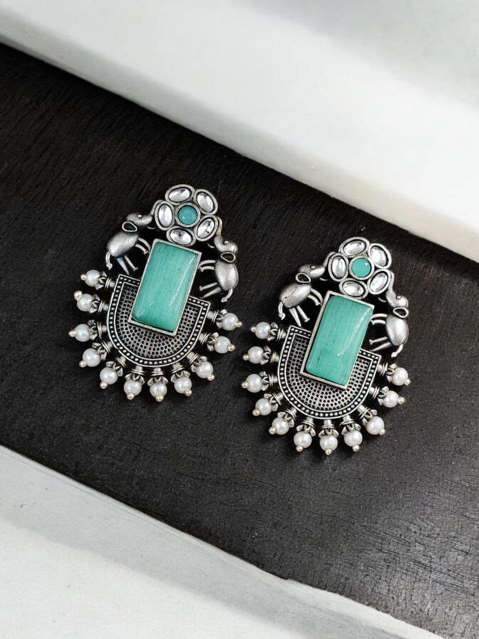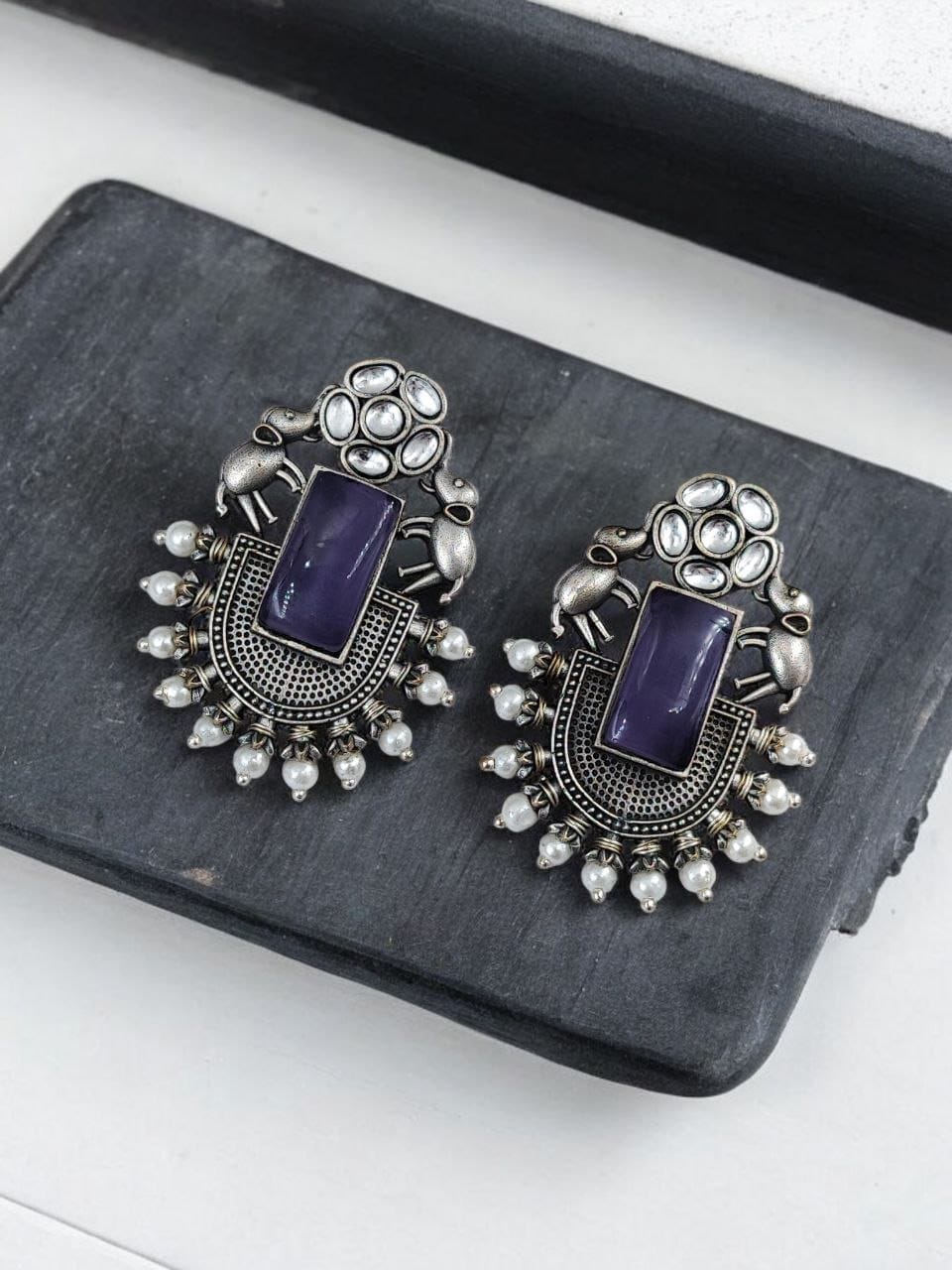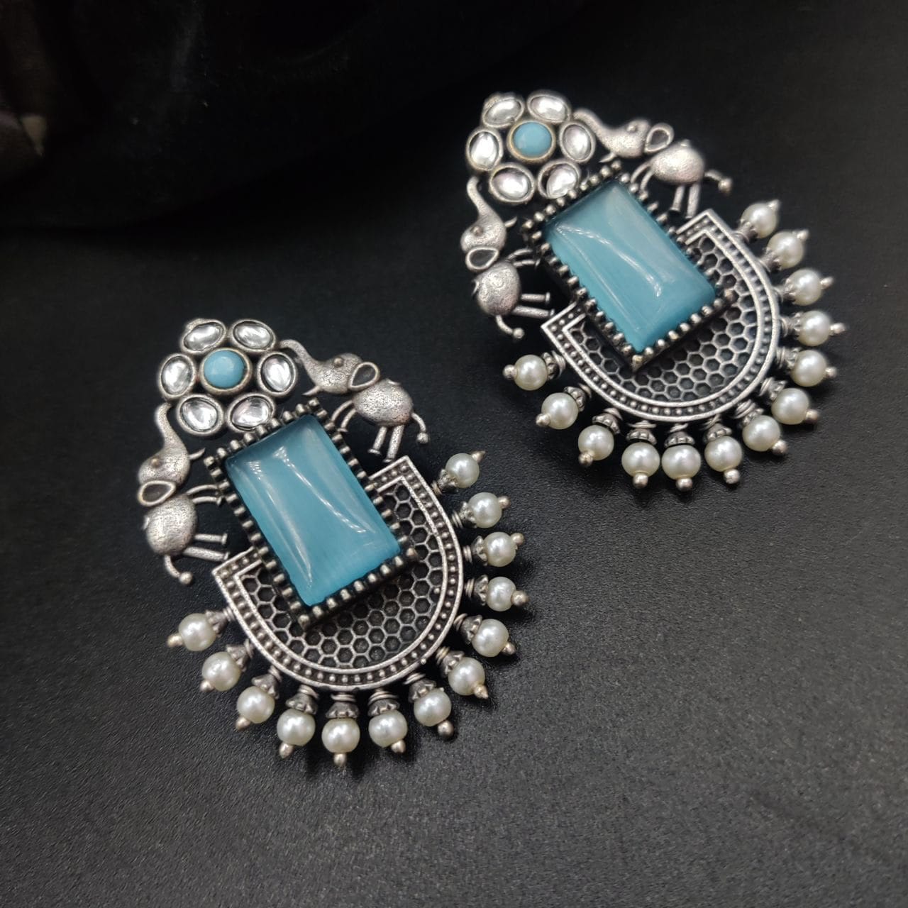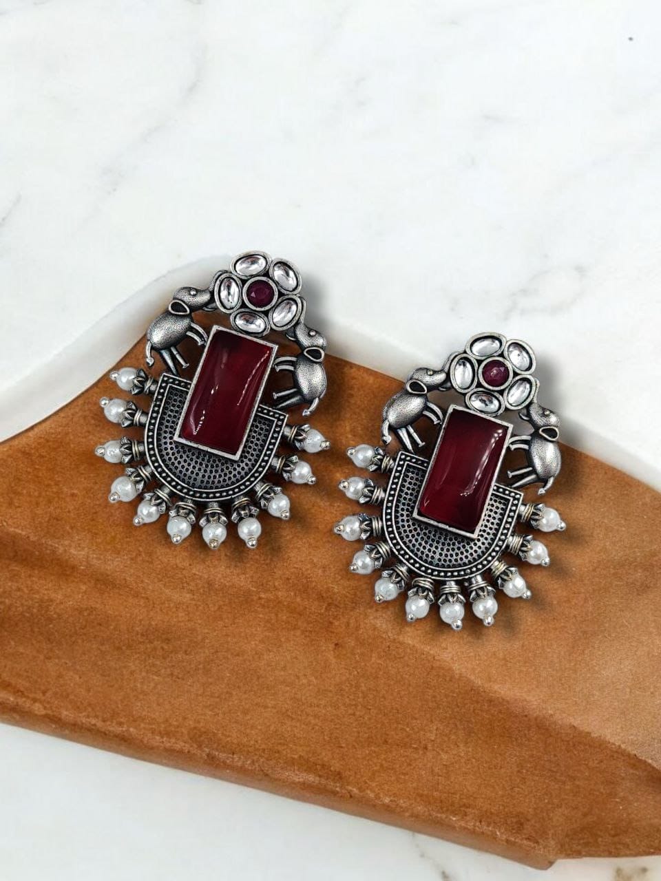 These silver replica Elephant Studs Earrings are crafted from high-quality materials, featuring a finely detailed elephant design that stands out beautifully against any backdrop. The oxidized finish enhances the intricate details, giving them a vintage charm that pairs seamlessly with both ethnic and modern outfits. Lightweight and comfortable, they are perfect for everyday wear or for adding a touch of elegance to your special occasions.