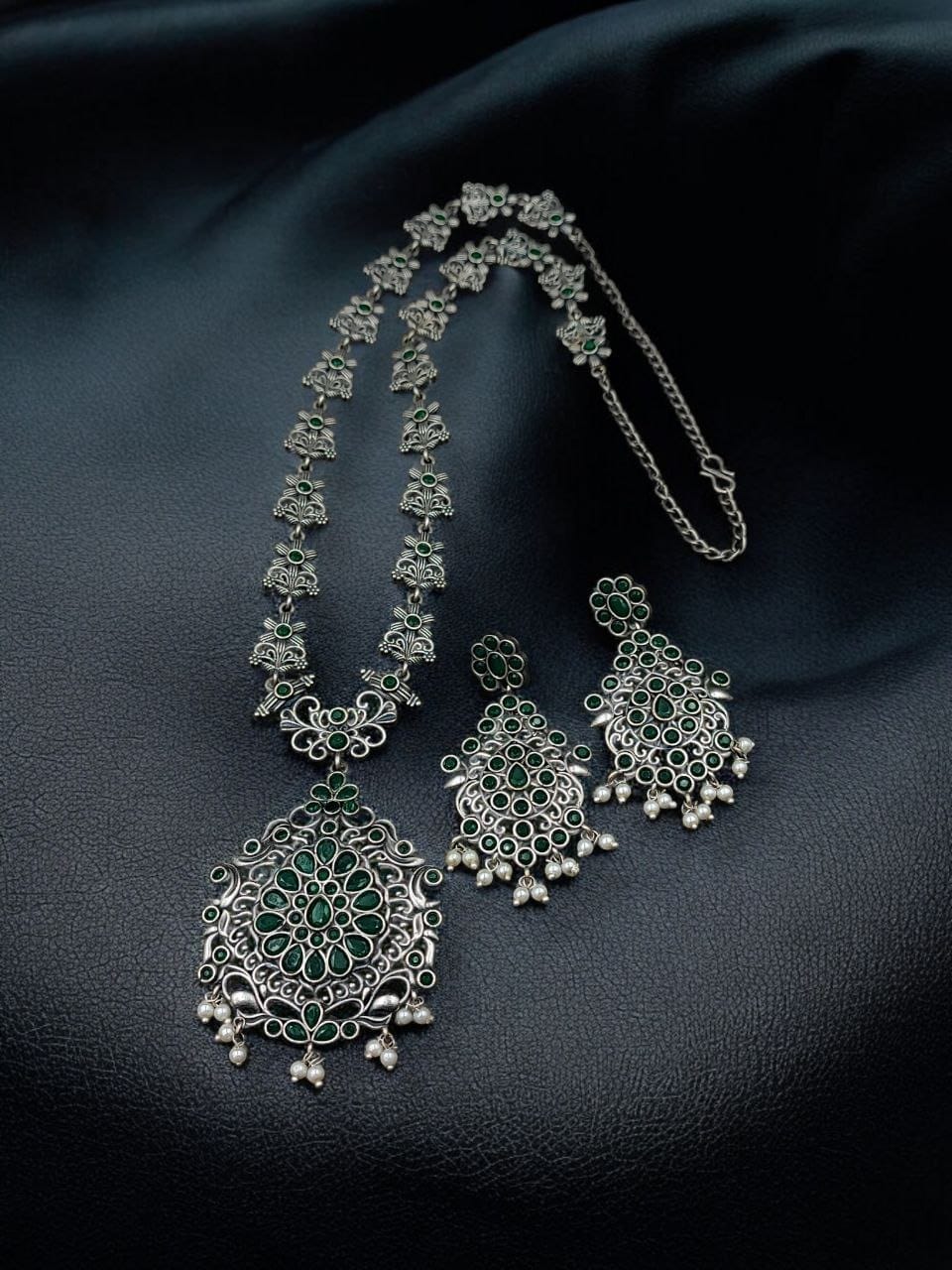 Adorn yourself with timeless elegance with the Silver Replica Long Haram Necklace Set, a perfect blend of traditional artistry and modern craftsmanship. This oxidized jewelry piece captures the essence of India?s rich cultural heritage, making it an ideal accessory for those who cherish classic designs.