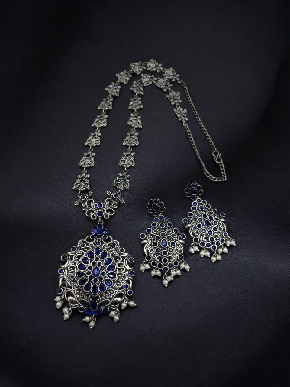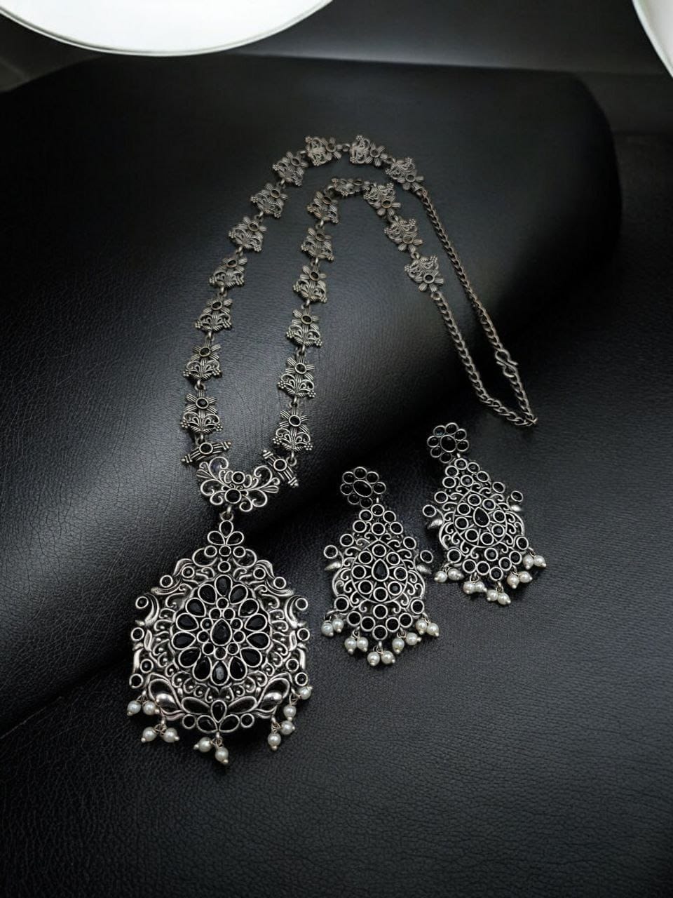 The Silver Replica Long Haram Necklace Set is a celebration of timeless beauty and heritage. Perfect for making a statement at weddings, festivals, or special events, this jewelry set is a testament to exquisite craftsmanship and classic elegance. Shop now to embrace the charm of traditional oxidized jewelry!