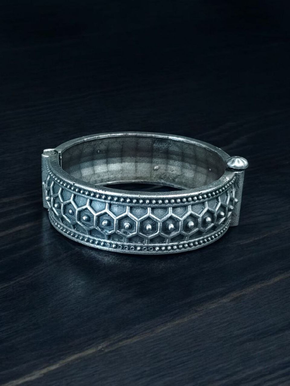 The openable design ensures ease of wearing, allowing you to adjust the bangle comfortably according to your wrist size. This makes it perfect for gifting, as it fits most wrists effortlessly. The intricate craftsmanship reflects traditional artistry, featuring detailed patterns inspired by ethnic heritage. Ideal for pairing with sarees, salwar suits, lehengas, or fusion wear, these oxidized silver bangles effortlessly enhance your overall ensemble with their classic charm.